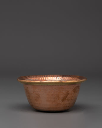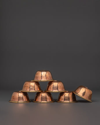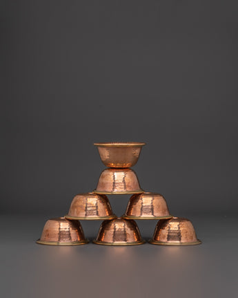 These bowls, used to represent the seven symbolic offerings (water for drinking, water for washing, flowers, incense, light, perfume, and food), are arranged in a straight line and filled daily during puja rituals. The hand-hammered copper construction ensures beauty while supporting a connection to traditional Himalayan spiritual craftsmanship. This set is perfect for practitioners seeking to enhance their altar with authentic ritual tools that honor Tibetan Buddhist tradition.