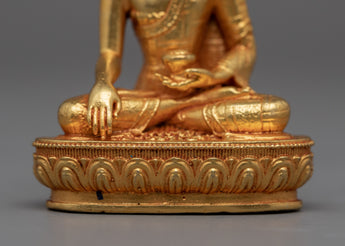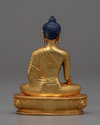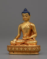 This Buddhist Shakyamuni Buddha Statue is made of copper that has been 24K gold plated. This machine-made Buddha Siddhartha Gautama Shakyamuni statue is a beautiful piece of art representing the important moment in Buddhist history when Buddha overcame the world's temptations and achieved enlightenment. Shakyamuni's right hand reaching for the earth, also known as the Bhumisparsha Mudra, symbolizes his victory over Mara and his determination to remain grounded in his path to enlightenment.