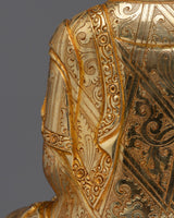 The lovely carvings on Shakyamuni Buddha's flowing robes, the lifelike characteristics of his face, and the complex patterns on his lotus seat are all enhanced by the sumptuous gold gilding. These features lend depth and brilliance to the statue, increasing its visual appeal and spiritual importance.