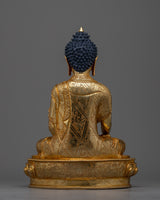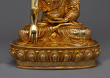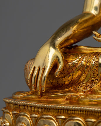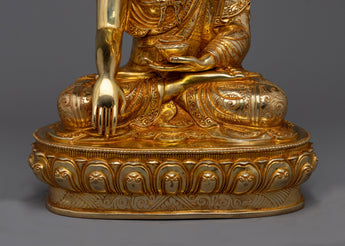 The finely sculpted "Shakyamuni Buddha Enlighten Teacher" statue represents the awakened one. This statue, standing 13.2 inches tall and weighing 3.99 kg, is crafted of sturdy copper and gilded with 24K gold. The gold and acrylic paintings emphasize the fine features of Shakyamuni Buddha's tranquil expression, meditative position, and the symbolic items he holds, which represent profound wisdom and serenity.