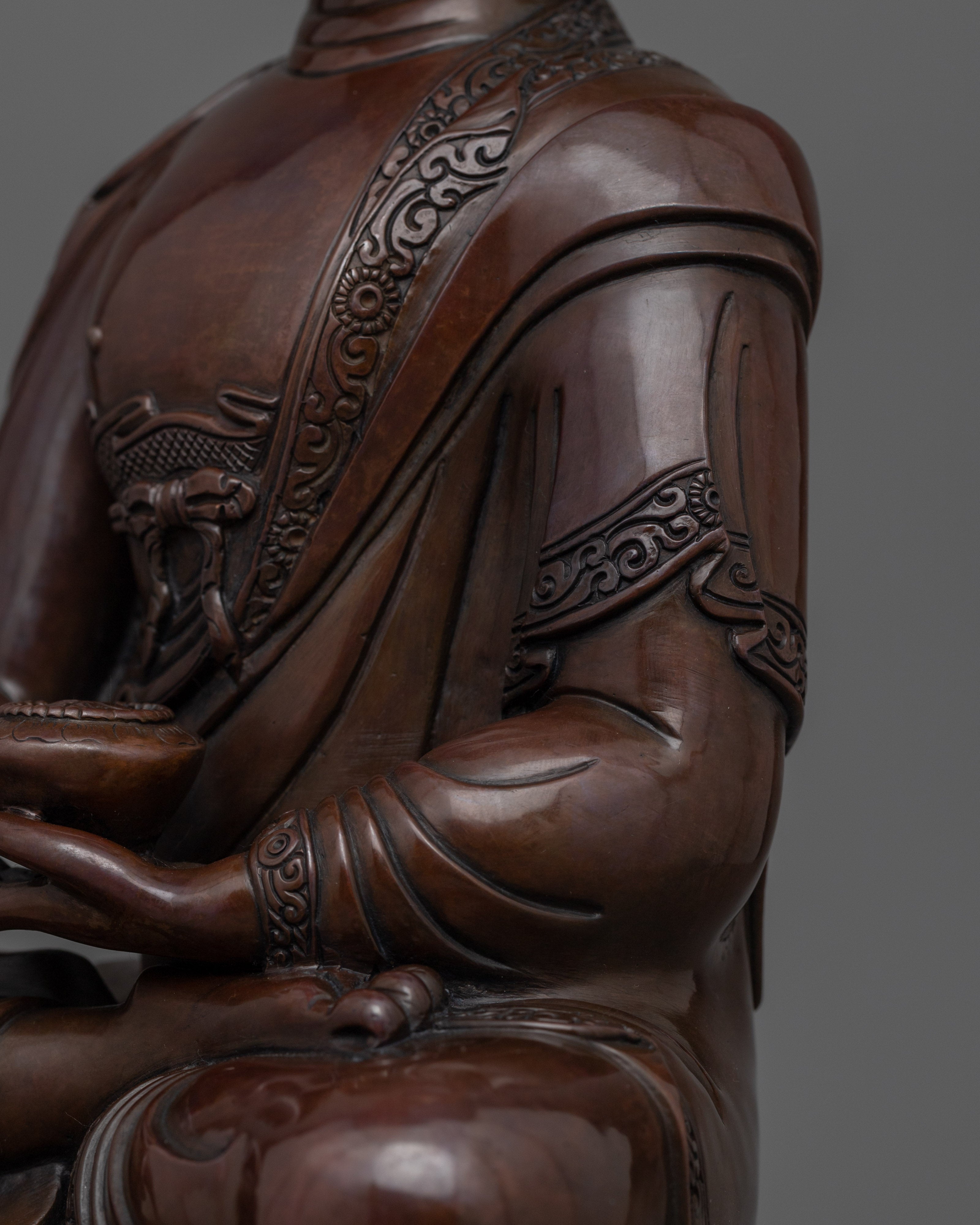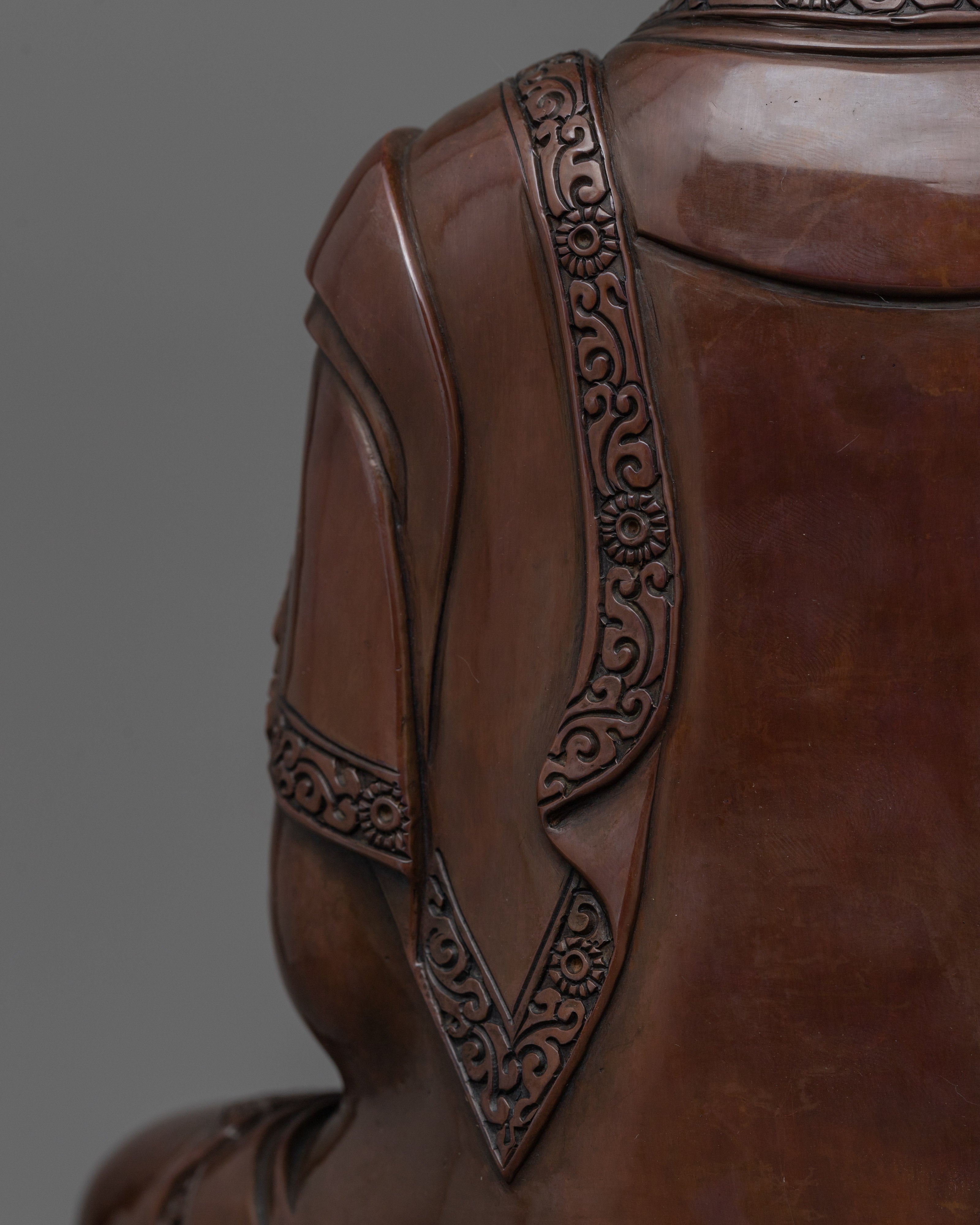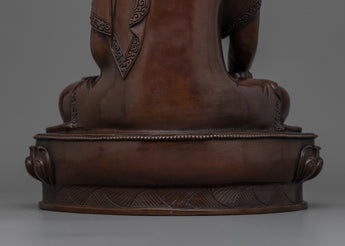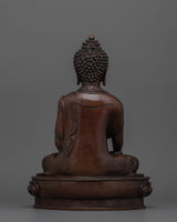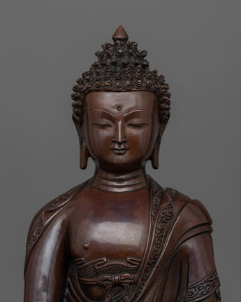 Shakyamuni Buddha Enlightened Art sculpture is a breathtaking depiction of the Buddha in his enlightened condition. This artwork stands 13.2 inches tall with a base width of 9.4 inches and weighs 3.65 kg. The statue, meticulously fashioned from oxidized copper, radiates an antique air that adds to its eternal beauty and religious presence.