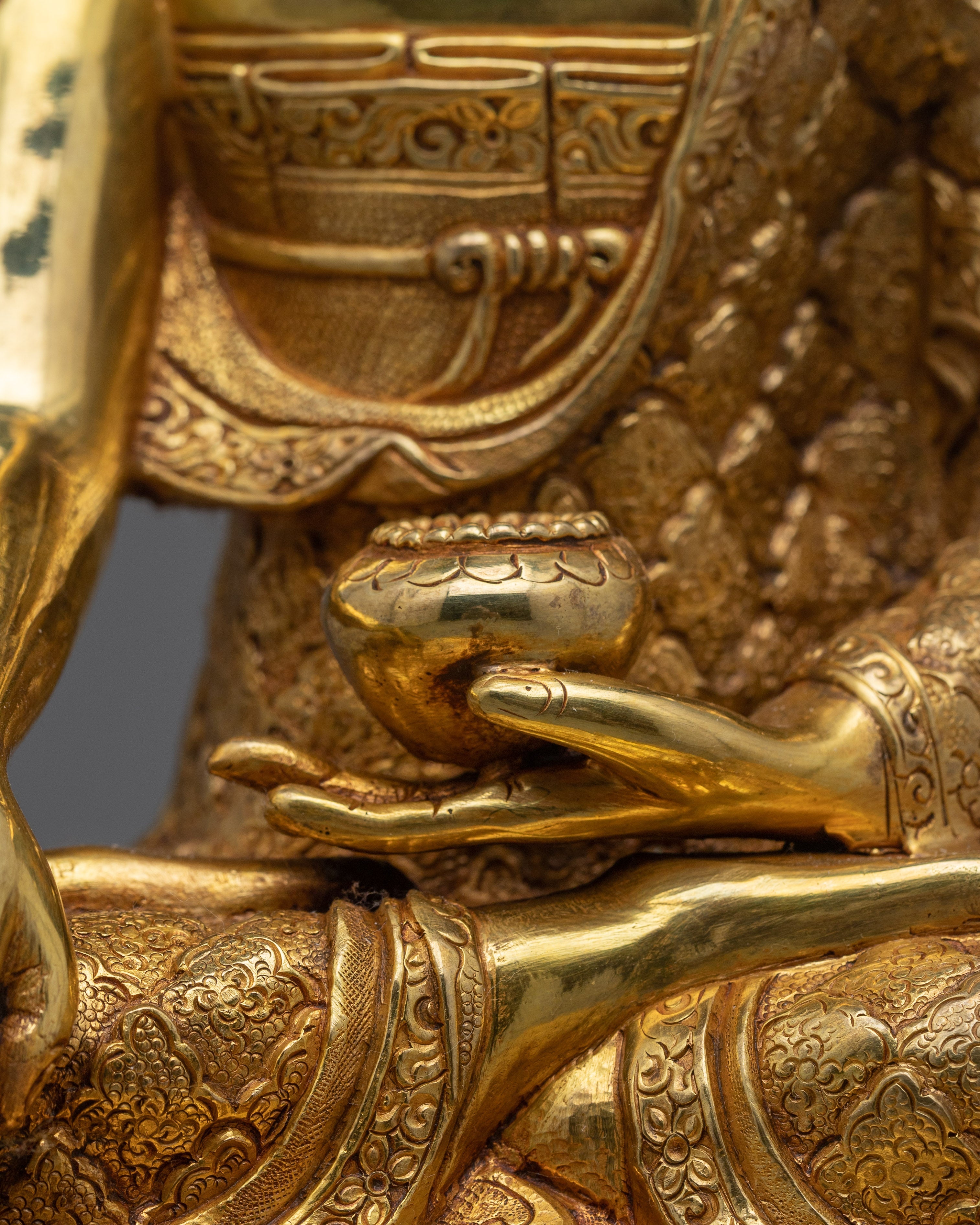 Embrace the Shakyamuni Buddha Gold Gilded Figurine and its radiant light of spiritual enlightenment. This stunning sculpture, which was made with great care and accuracy, captures the spirit of calm and inner peace. It is 15 inches tall and has a base that is 10.2 inches in diameter. It radiates calm and a sense of spiritual enlightenment. This statue, with its elaborate acrylic paintings and 24K gold gilding on a copper body, embodies the heavenly presence of Shakyamuni Buddha.