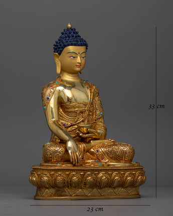 Presenting the Shakyamuni Buddha Gold-Gilded Statue, a majestic depiction of the Buddha's creator intended to evoke inner serenity and wisdom. This statue, which is 33 cm (13 inches) tall and rests on a 23 cm (9.1 inch) base, is a spiritual awakening symbol that may be placed in any house or place of meditation.