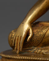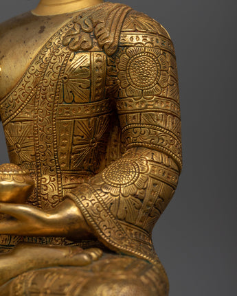 This Shakyamuni Buddha Handcrafted Antique-Touch Statue stands 36.5 cm tall and is made of high-quality copper with gorgeous 24K gold gilding that showcases the intricate features of his monastic robes and tranquil facial expression. The statue weighs 3.19 kg, which provides stability and presence. Each fold of the robe and feature of Buddha's serene expression is precisely highlighted, showcasing the fine artistry involved.