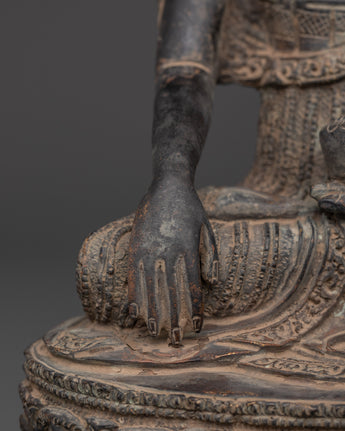 This Shakyamuni Buddha Himalayan spiritual statue measures 28 cm in height, 22 cm in width, and weighs 2.37 kg. Crafted from oxidized copper, this statue features precise workmanship and an attractive finish that captures Buddha's tranquil and knowledgeable presence. Its oxidized and traditional design makes it an excellent focal point for meditation rooms, altars, and spiritual collections.