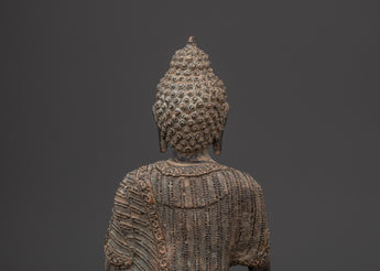 Shakyamuni Buddha, the founder of Buddhism, represents the path to enlightenment by expressing calm, knowledge, and the possibility of human development. His position, with a tranquil smile and a calm hand gesture, represents the transmission of wisdom and compassion. The oxidized copper finish lends it a deep, sacred look that emphasizes its spiritual value.