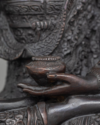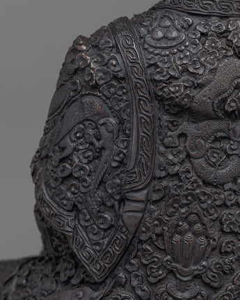 This statue of Shakyamuni Buddha portrays his enlightened state, with his right hand extended in bhumisparsha mudra, the gesture of calling the Earth to witness his moment of enlightenment, and his left hand resting in dhyana mudra upon his lap, indicating his unbroken inner serene. This statue is an amazing focal point for meditation rooms or sacred shrines, inviting mindfulness, compassion, and inner calm into your life while preserving the Enlightened One's teachings.