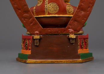 Shakyamuni Buddha, the enlightened one, is the venerated figure central to Buddhism. His teachings lead practitioners down the road of compassion, awareness, and enlightenment. Seated on a throne, he represents the Buddha's elevated role as a teacher and defender of the Dharma, providing calm and spiritual direction to those seeking it.