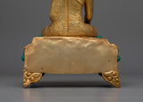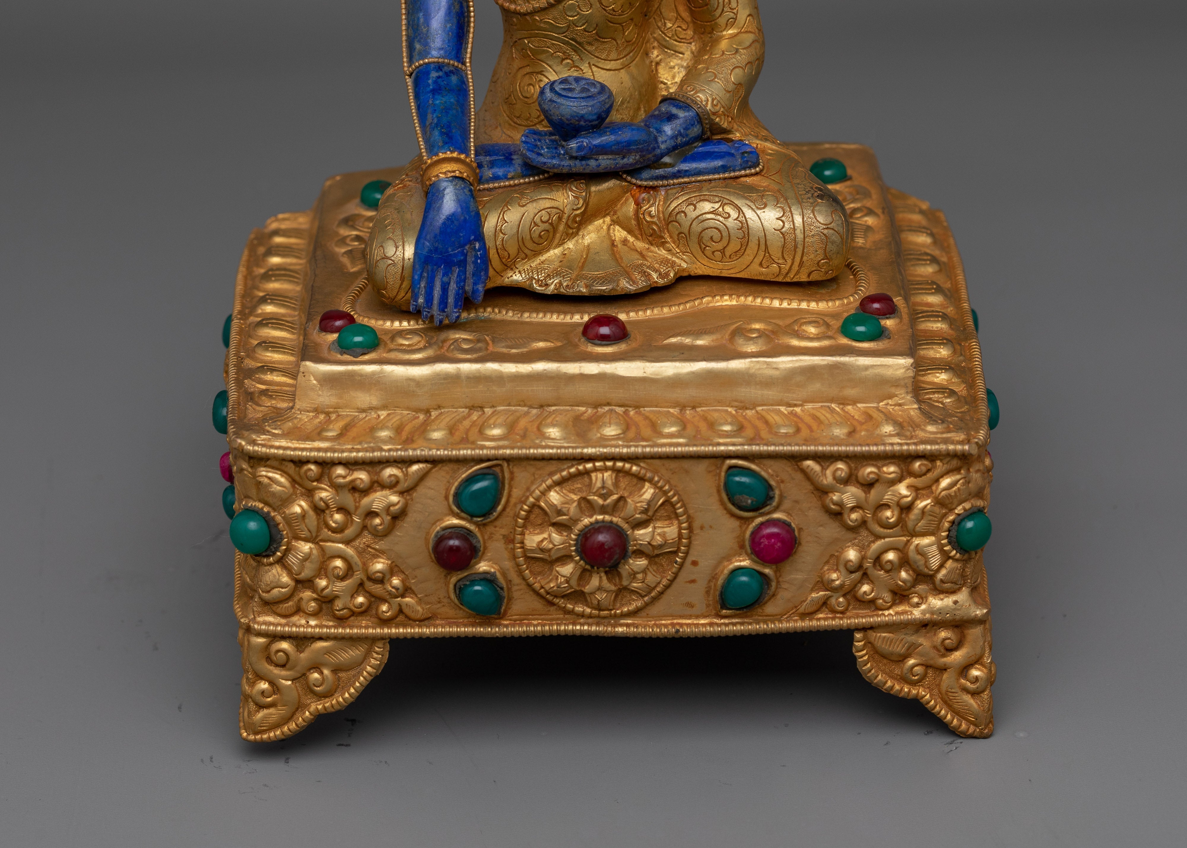 This statue is very well-made, with a lapis stone body that is well-known for its rich, celestial blue colors that represent knowledge and truth—qualities that are representative of Shakyamuni Buddha himself. The delicate details on the robes and the calm attitude are emphasized by the elaborate gold and acrylic paintings and 24K gold gilding, which produce a striking visual contrast. Every element of the statue is in harmony with Shakyamuni's teachings on serenity and enlightenment thanks to the hand-carved gemstones, which also lend an air of sophisticated refinement. Its 1.57 kg weight has a transforming and anchoring effect.