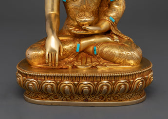 The Shakyamuni Buddha Nepalese Handcrafted Statue stands 22.5 cm tall and is expertly crafted from high-quality copper. This statue's beautiful 24K gold plating adds to its glowing presence and spiritual importance. Shakyamuni Buddha's tranquil look, portrayed with artistic accuracy, brings a sense of peace and enlightenment to any setting. The complex patterns on his clothing, as well as the beautiful lotus seat he sits on, are highlighted by the precise carving.