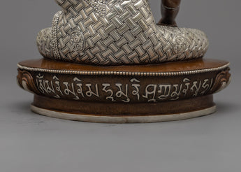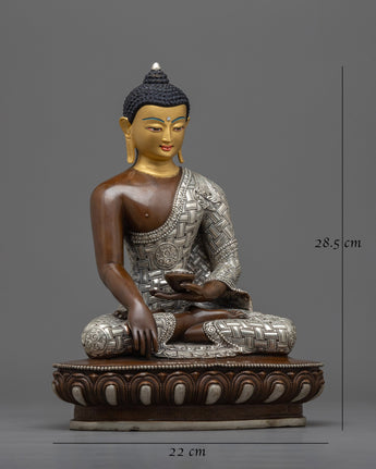 The Shakyamuni Buddha Oxidized Figurine is a symbol of enlightenment and serenity. Accept its calming presence. With a height of 11.2 inches and a base diameter of 8.7 inches, this sculpture radiates peacefulness and profound spiritual meaning. It is handcrafted with careful consideration to detail and has beautiful gold and acrylic paints that add to the holy aura. This sculpture, which is made of an oxidized copper body with silver-plated embellishments, captures the spirit of Buddhism and invites you to set out on a path of self-discovery and enlightenment.