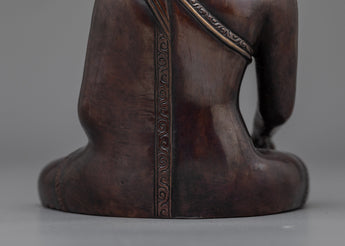 The figure's oxidized copper finish, which symbolizes the timeless essence of the Buddha's teachings, gives it a distinctive, antique-inspired beauty. This statue acts as a continual reminder of the road to enlightenment, mindfulness, and compassion.