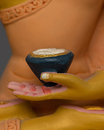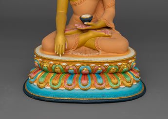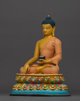 This sculpture, ideal for your Buddhist shrine or meditation room, will provide a sense of peace and enlightenment, improving the spiritual ambiance of any environment. This Shakyamuni Buddha statue is regarded as a sacred emblem of knowledge, compassion, and awakening. Standing at a graceful 12" (30.5 cm) tall with an intricate copper body, it is 24K gold gilded to increase its spiritual resonance, complemented by beautiful acrylic paintings of the Buddha's tranquil and compassionate presence.