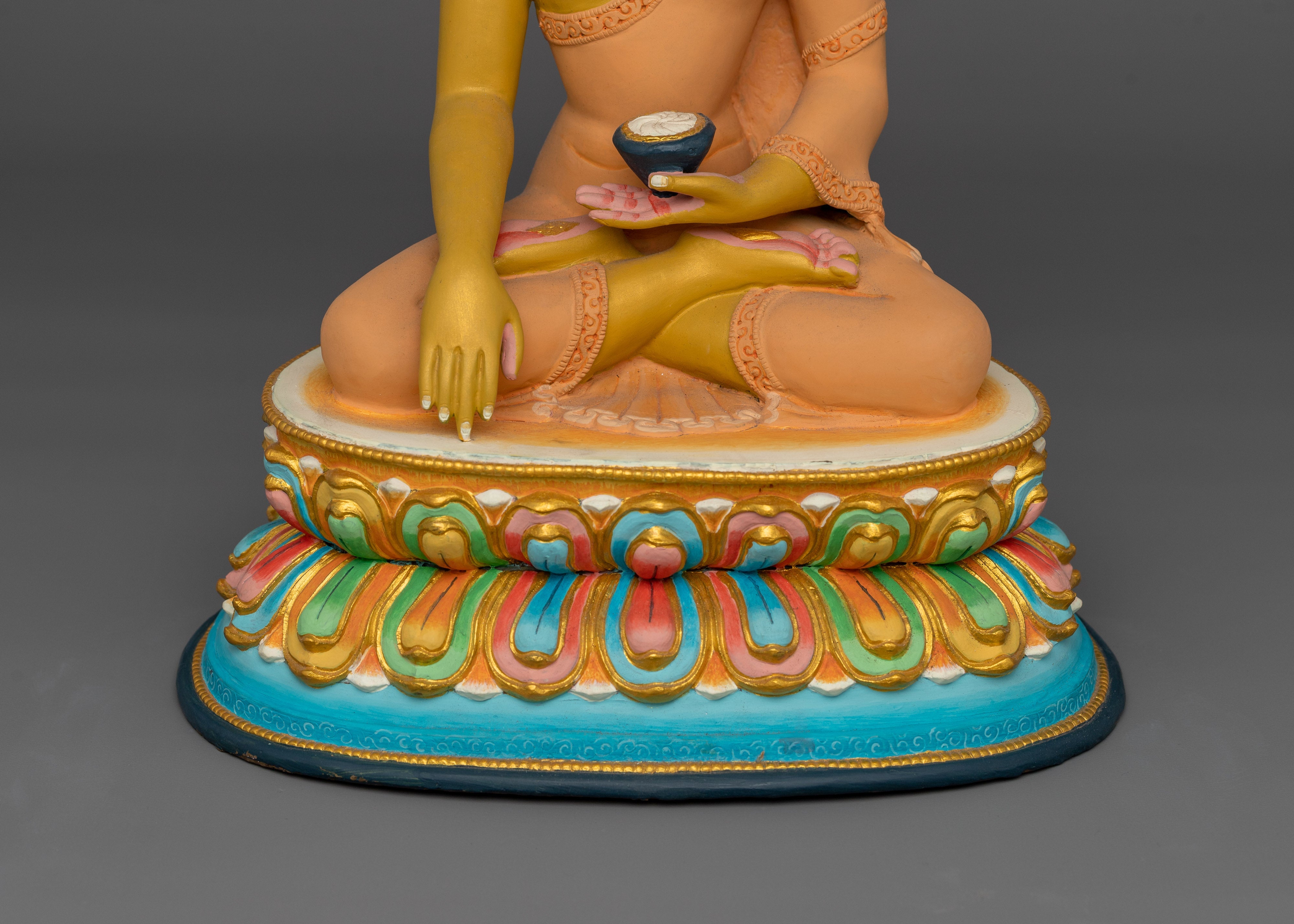 Shakyamuni Buddha is depicted sitting in the lotus pose (padmasana), indicating his steady concentration and mastery over the distractions of the material world. His right hand stretched toward the earth in bhumisparsha mudra, represents his moment of enlightenment, inviting the earth to witness his waking. The left hand, lying gently in his lap in dhyana mudra, depicts the profound state of meditation and mindfulness that leads to insight and clarity.
