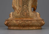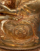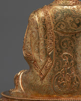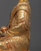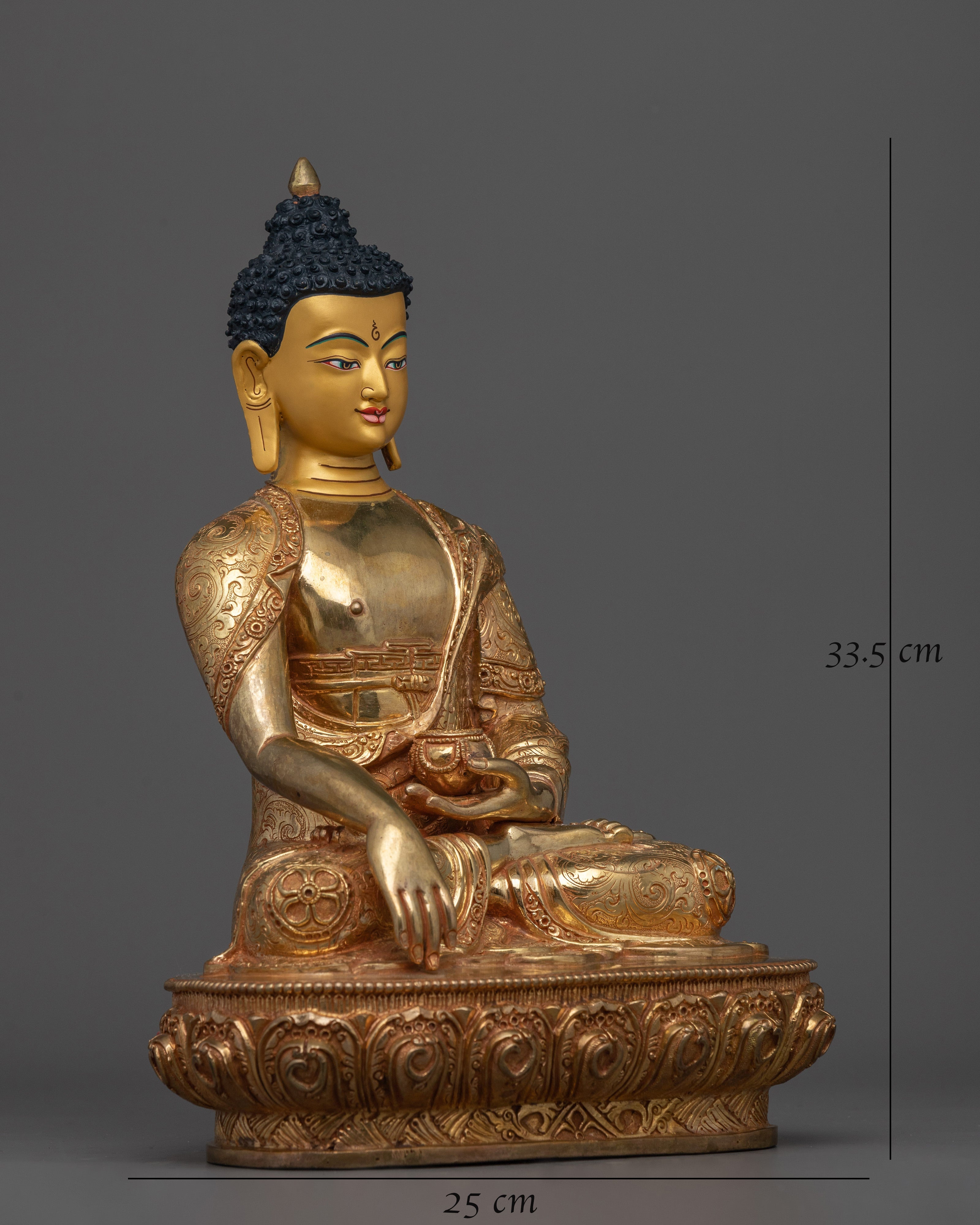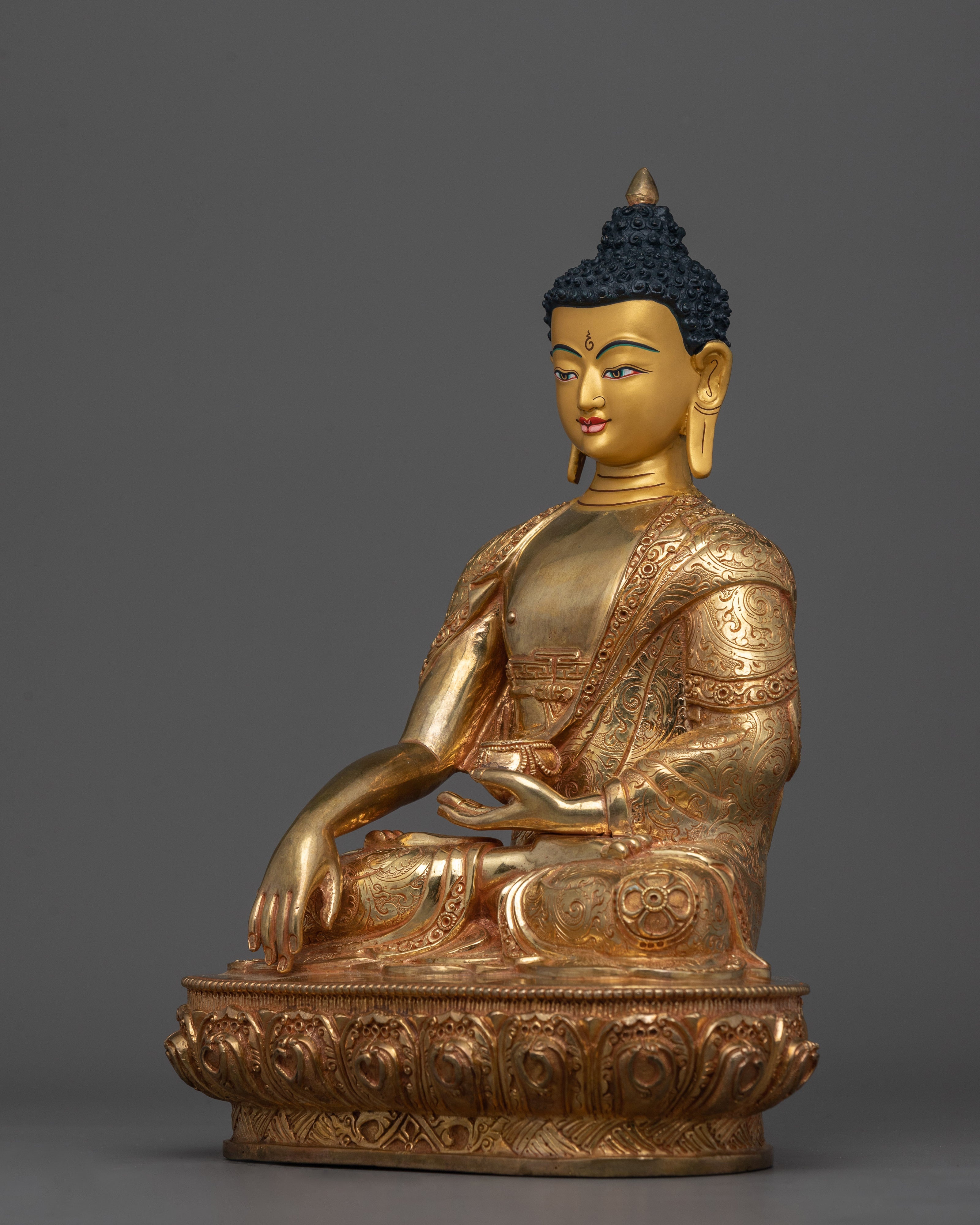 This statue of Shakyamuni Buddha Sage of the Shakya clan, measuring 13.2 inches in height and 9.8 inches in base, is a masterful depiction of the Enlightened One. It is skillfully designed from a copper body and is gilded in 24K gold. The 4.25 kilogram statue gains visual appeal and a profound symbolic significance through the addition of gold and acrylic paints. The combination of materials not only highlights the statue's artistic form but also gives it a feeling of spiritual importance, making it a treasured addition to any Buddhist temple or place of meditation.