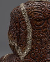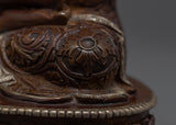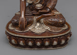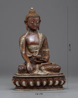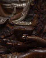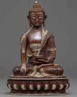 In our studio artist gently carved the deity sculpture from head to toe. This Shakyamuni Buddha sculpture is formed from a pure oxidized copper body with silver plating on his monk robe, the top of his Ushnisha, and the edge of the Pema, as well as on the top part of an alms bowl. He signifies Bhumi-Sparsa Mudra (The earth-touching Gesture) on his right hand, whereas he places A monk's bowl on his left hand. He is pictured sitting on a moon Disc lotus seat.
