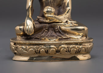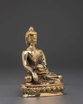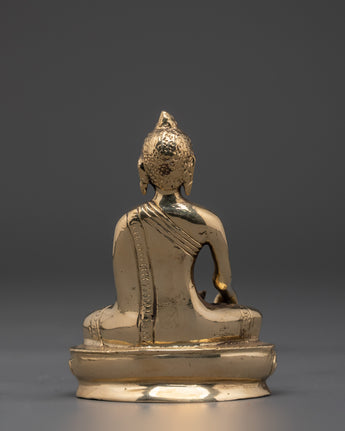 This gorgeous Shakyamuni Buddha statue for serene decor is skillfully carved from brass and measures 11.5 cm in height and 8 cm in width, making it an excellent addition to any meditation altar or holy place. The polished golden finish adds to its beautiful form, highlighting the delicate workmanship of the flowing robes and the calm look that conveys peace and heavenly knowledge. Its small size allows it to sit well on shelves, tables, or altars, providing any space with a serene ambiance.