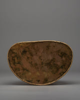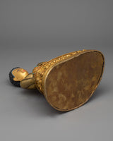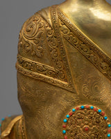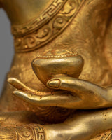 This copper Shakyamuni Buddha Statue, a stunning work of Vajrayana art, was painstakingly hand-carved in our workshop by skilled carvers. The statue was then gilded with 24K gold, which gave it an exquisite shine. With his right hand on the ground, the Buddha is depicted as appealing to the soil to witness either his victory over Mara or the moment of his enlightenment. He is seated on a moon-disc lotus seat. The Buddha is depicted holding an alms bowl as an additional indication of his rejection of material concerns and commitment to the path of enlightenment. A truly exquisite work of art has been created as a result of careful and exacting attention to every last detail.