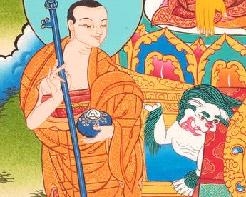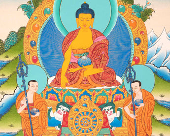 Historically, the Shakyamuni Buddha is esteemed as the Supreme Buddha, an enlightened being who attained profound insight into the nature of existence and liberated himself from the cycle of birth and rebirth. Despite misconceptions, the Buddha is not considered a god but a human who achieved an extraordinary understanding of life, thus providing a path for others to follow. This thangka, especially when depicting the Buddha with his disciples, serves as a visual encapsulation of his teachings and the legacy of enlightenment he imparted to the world.