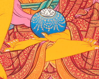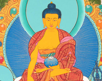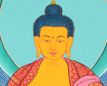 The Shakyamuni Buddha Thangka is a profound representation of the historical Buddha, Siddhartha Gautama, who is the founder of Buddhism. In this thangka, Shakyamuni Buddha is depicted seated in the vajra posture on a white moon disc and lotus, signifying purity and enlightenment. His right hand is often shown in the Bhumisparsha mudra, the gesture of calling the Earth to witness his enlightenment, while his left-hand rests in his lap in the gesture of meditation, holding a begging bowl.