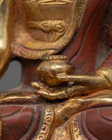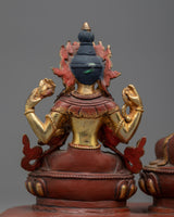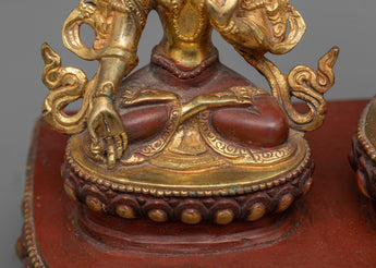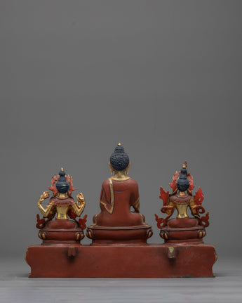 Take the Shakyamuni Buddha with Sitatara and Chenrezig statue on a spiritual journey towards enlightenment. The Buddha's compassion and wisdom are embodied in this finely detailed sculpture. Seeking inner serenity and enlightenment, this sculpture, which stands 11.6 inches tall with a 12-inch circle base, serves as a reminder. This statue exudes spiritual energy and is adorned with elaborate acrylic paintings and 24K gold plating.