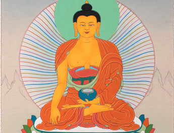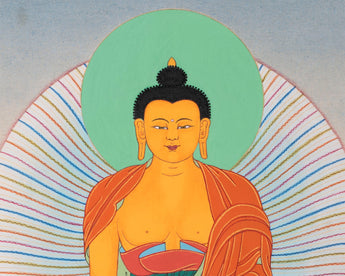 This Buddhist wall scroll painting of Shakyamuni Buddha using acrylic colors is painted in the ancient Karma Gadri. In the brocade thangka, Amid a cover of white clouds, Buddha sits on a moon disc lotus seat that appears to be floating in the air near the lake with colorful petals. His right-hand gestures to touch the earth while his left hand holds a begging bowl. He wears an orange robe draped around his body while his left arm is bare, representing the traditional buddha style. The bright halo and the bright nimbus behind him give the thangka a divine look.