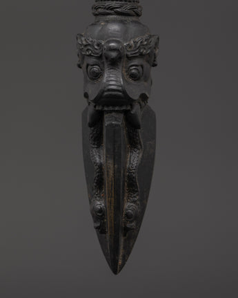 Harness divine energy with the Shaligram Phurba Dagger, a treasured tantric ritual implement utilized in Vajrayana Buddhist and Hindu ceremonies. This three-sided blade, 27 cm tall and 5.5 cm wide, is beautifully carved from saligram, a rare and spiritually powerful fossil stone found only in the Gandaki River region of Nepal. Saligram is revered in both Hinduism and Buddhism for its powerful spiritual force and is seen as a manifestation of Lord Vishnu.
