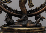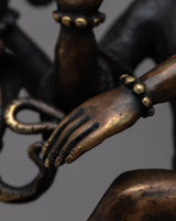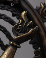 The Engraved Shiva Nataraj Statue is a mesmerizing work of art, skillfully handcrafted on a sturdy brass body. Capturing the divine essence of Lord Shiva in his dynamic and captivating Nataraj form, the statue portrays the deity in a graceful and powerful dance pose. Every intricate detail, from the flowing locks of hair to the multiple arms and the cosmic ring of fire, is meticulously engraved, showcasing the artisan's mastery and dedication. This exquisite representation not only celebrates the divine energy of Lord Shiva but also serves as a visual embodiment of cosmic balance and creation, making it a cherished piece for devotees and art enthusiasts alike.