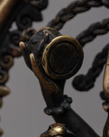 Nataraj, also known as Nataraja, depicts the Hindu god Shiva as the cosmic dancer. The word "Nataraj" is a combination of two Sanskrit words, "Nata," which means dance, and "Raja," which means king, and thus translates to "King of Dance." Shiva's dynamic and rhythmic movements characterize the image of Nataraj as he performs the Tandava, a vigorous dance representing the eternal cycle of creation, preservation, and destruction in Hindu mythology.