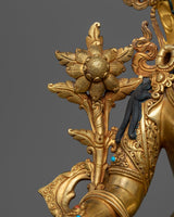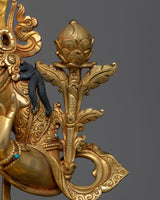We are pleased to present our "Shri Beautiful Green Tara" statue, an amazing depiction of the goddess of protection and kindness. This statue stands 13.4 inches tall and weighs 4.27 kg. It is carefully crafted from a sturdy copper body and decorated with 24K gold plating. The combination of gold and acrylic paintings highlights the minute details of Green Tara's tranquil look, poised posture, and symbolic symbols she holds, which reflect deep compassion and a protective spirit.
