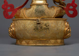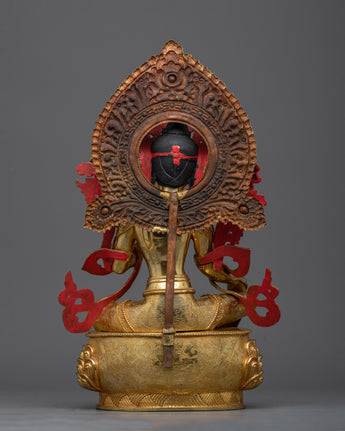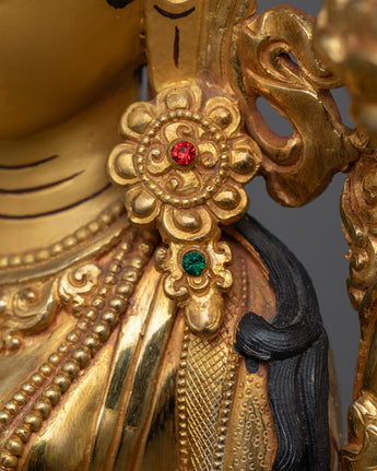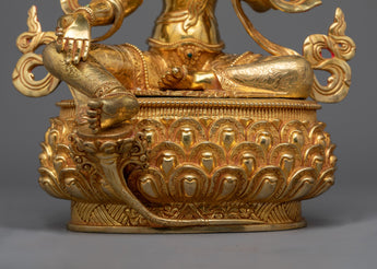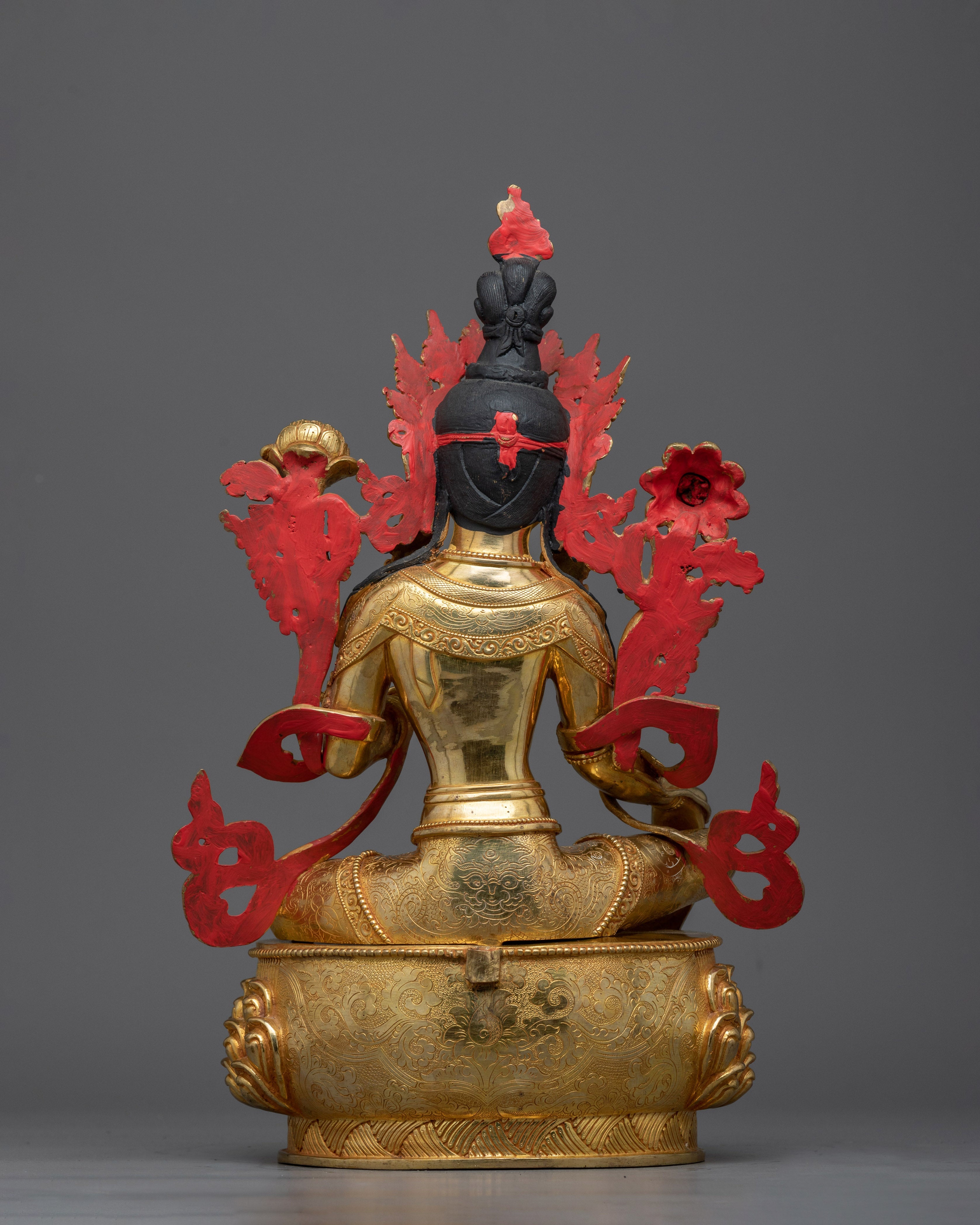 This monument of Green Tara is more than simply ornamental; it is a powerful representation of empathy and protection. Its rich gold finish and detailed crafting not only make it more visually appealing, but they also align with Green Tara's attributes of proactive compassion and prompt support. This statue is perfect for any room used for meditation, spiritual contemplation, or serenity since it promotes a calm and heavenly feminine atmosphere.