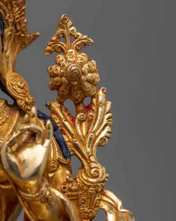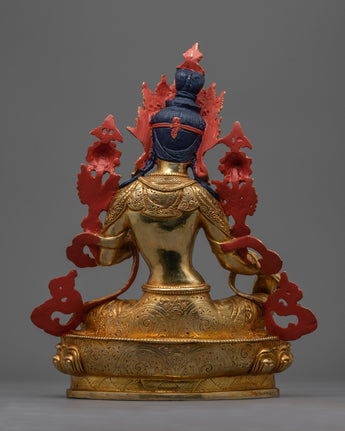 With its exquisitely sculpted copper body and 24K gold gilding, this magnificent statue accentuates the minute details of Tara's flowing robes and elegant stance. Her visual appeal is enhanced by the vivid gold and acrylic paints, which highlight the lush vegetation that goes with her name and her attitude of calm readiness to act. She is ready to get up and help those in need as seen by her extended leg and open palm motions.
