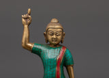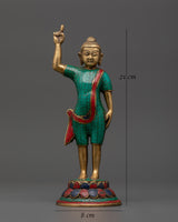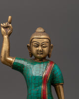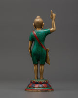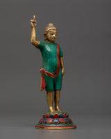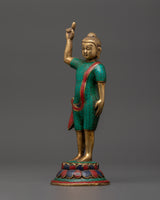 This exquisitely carved Siddhartha Gautama brass statue depicts the Buddha's birth and is a perfect way to celebrate the magnificent moment of enlightenment's first spark. This revered figurine, which stands 21 cm tall and 8 cm broad, depicts the well-known position of the newborn Siddhartha staring up at the sky, signifying his enlightenment and awakening. Ideal for altars, meditation areas, or spiritual exhibits, this sculpture symbolizes the most revered and initial phase of the Buddha's life.