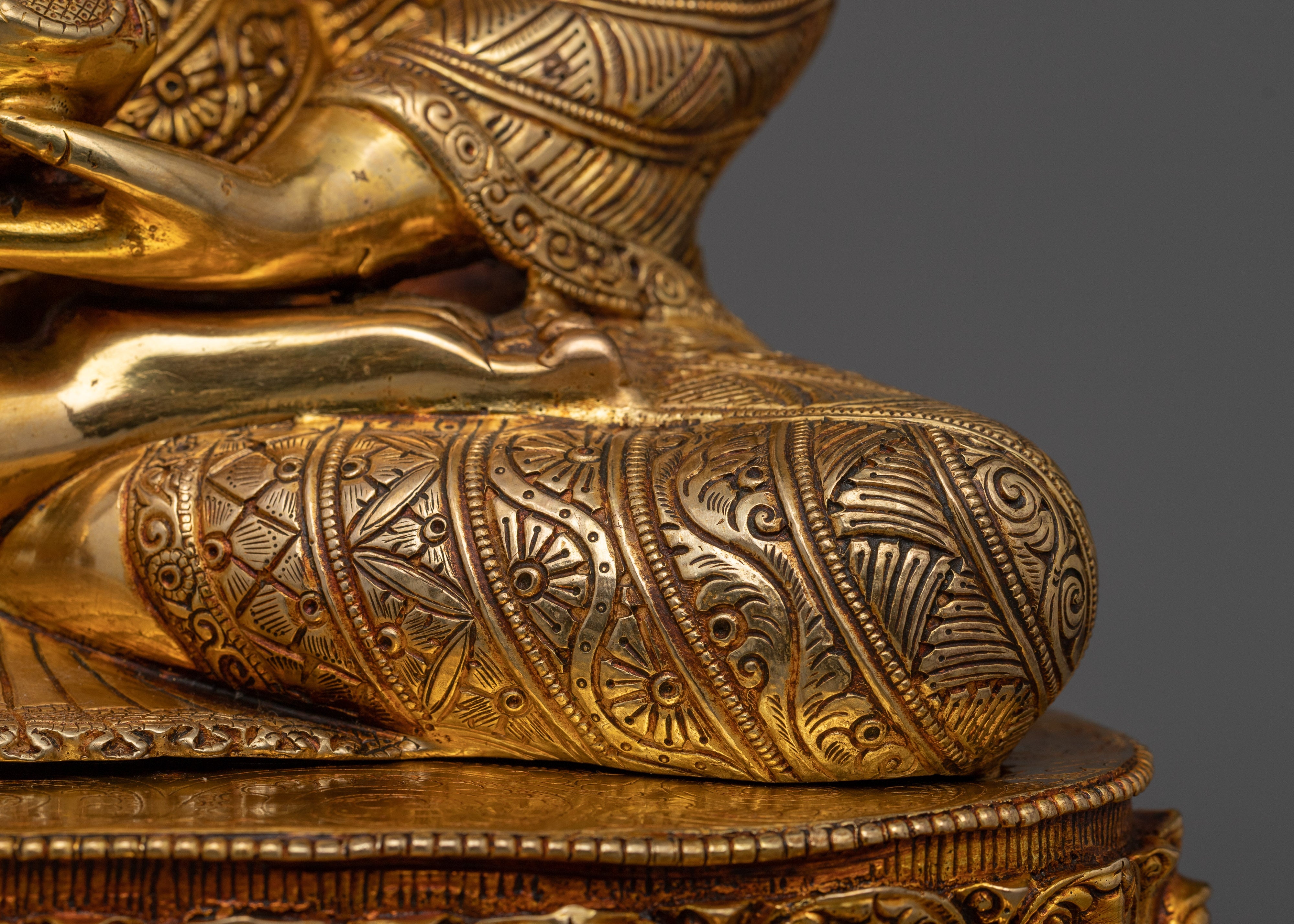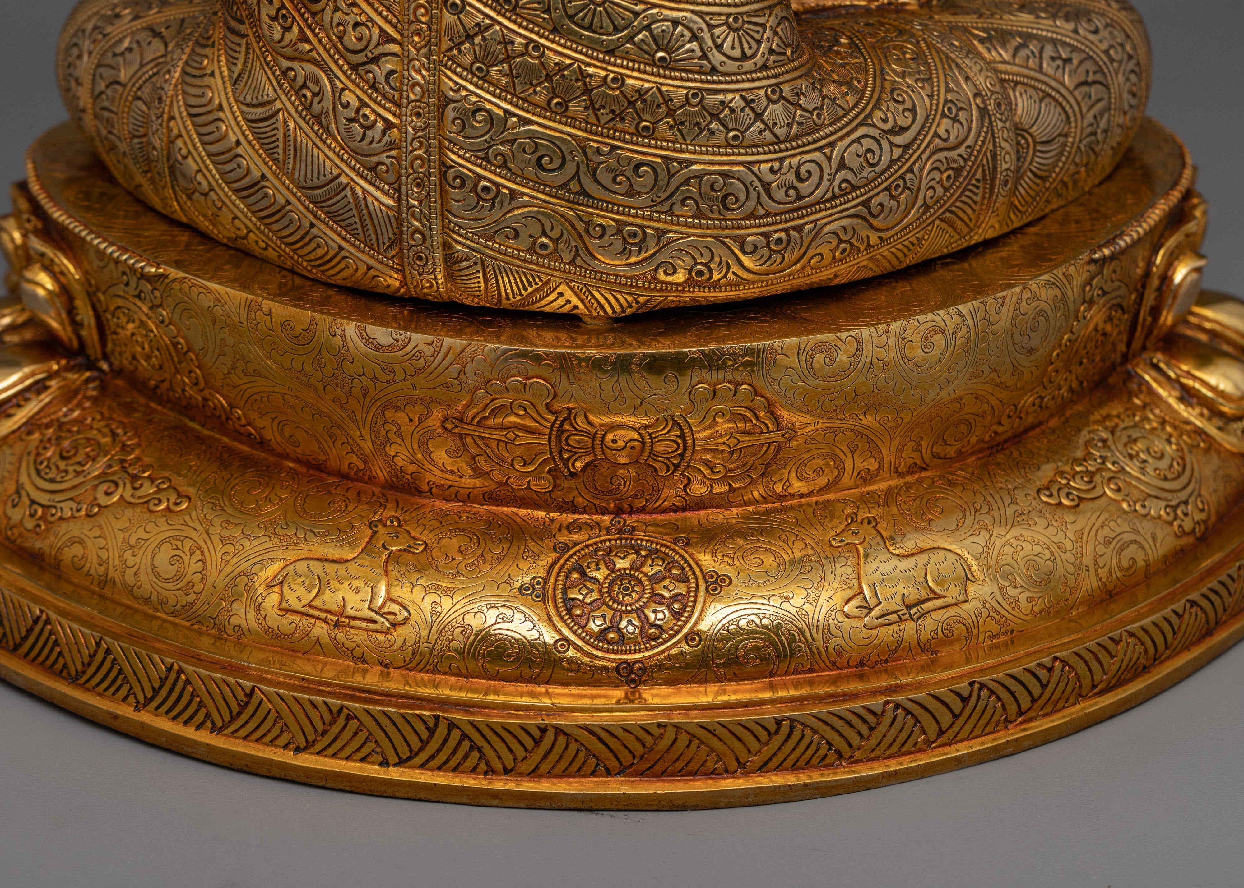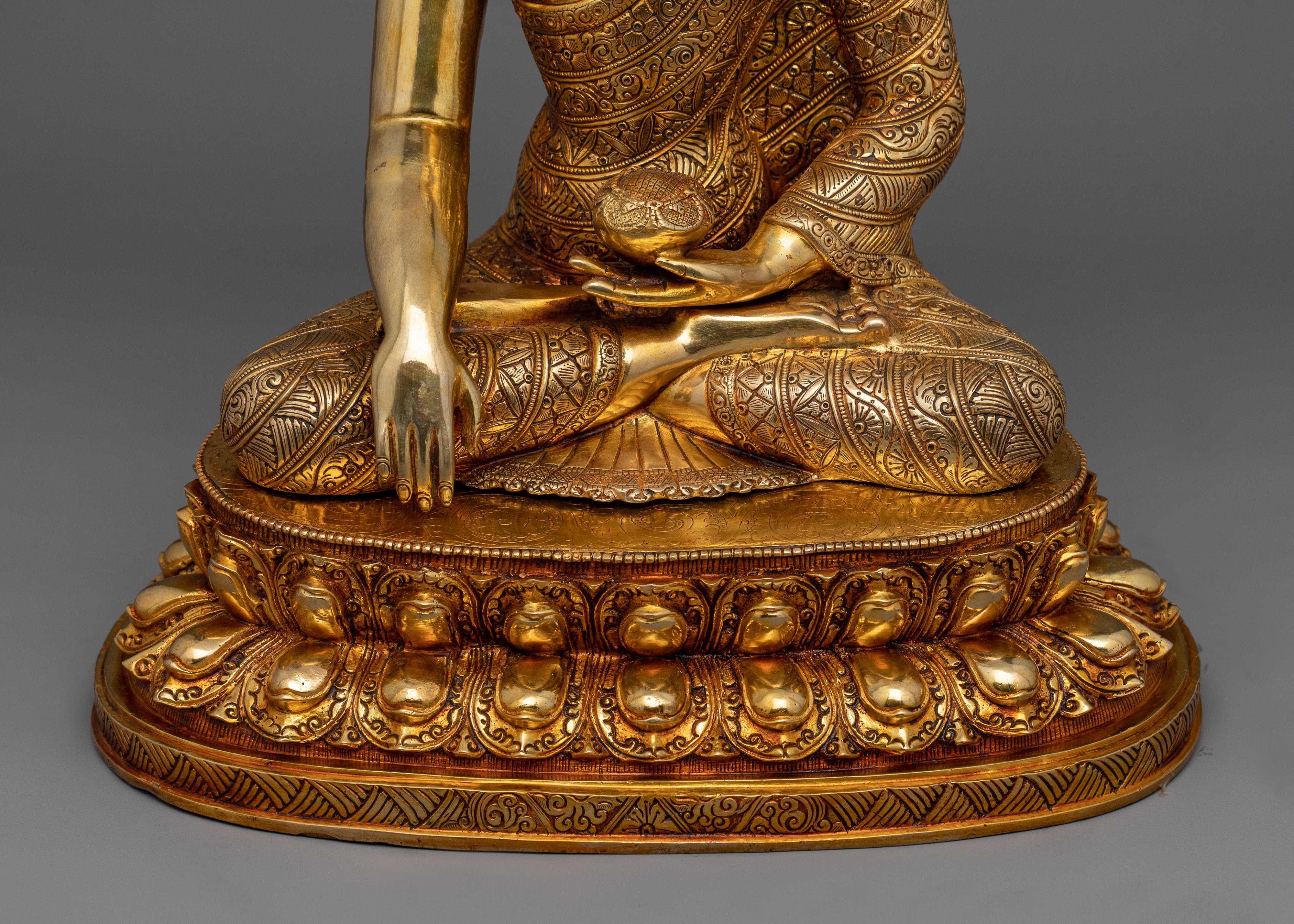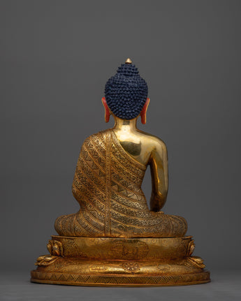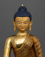 With its impressive 17.3-inch height, this Siddhartha Gautama Buddha Statue is a monument to the fine craftsmanship of Tibetan artists. This statue embodies the heavenly peace of the awakened presence of Buddha. It is handcrafted with a copper body and embellished with beautiful 24K gold gilding. The substantial 14-inch base offers a framework for this imposing work of spiritual art, and the elaborate paintings in gold and acrylic highlight the subtle features of the Buddha's face and garments. This statue, which weighs 7.80 kg, is intended to be the center of attention in your sacred area and to provide both aesthetic appeal and spiritual meaning.