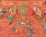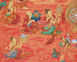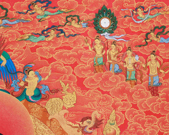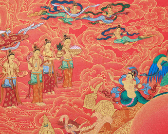 At the center, Gautama Buddha is depicted in a serene meditative pose, seated on a lotus throne with a radiant halo symbolizing enlightenment. It features intricate scenes of celestial beings, deities, and symbolic motifs, and his two principal disciples, Shariputra and Maudgalyayana, at his sides. The vibrant red background enhances the spiritual energy, making it an inspiring and meditative artwork.