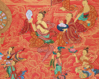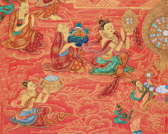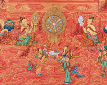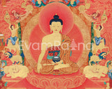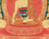 An exquisite example of Nakthang Artistry, a celebrated Tibetan Buddhist art form known for its spiritual significance and aesthetic depth, is this Siddhartha Gautama Buddha Thangka. The intricate golden details on the cotton canvas symbolize wisdom, purity, and enlightenment, created with genuine 24K gold and vibrant acrylic colors. The deep red background represents the passionate energy of spiritual awakening and transformation, infusing the artwork with a sense of light and tranquility.