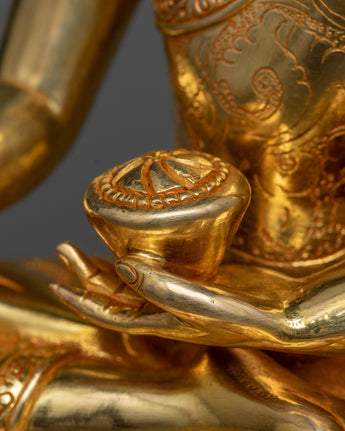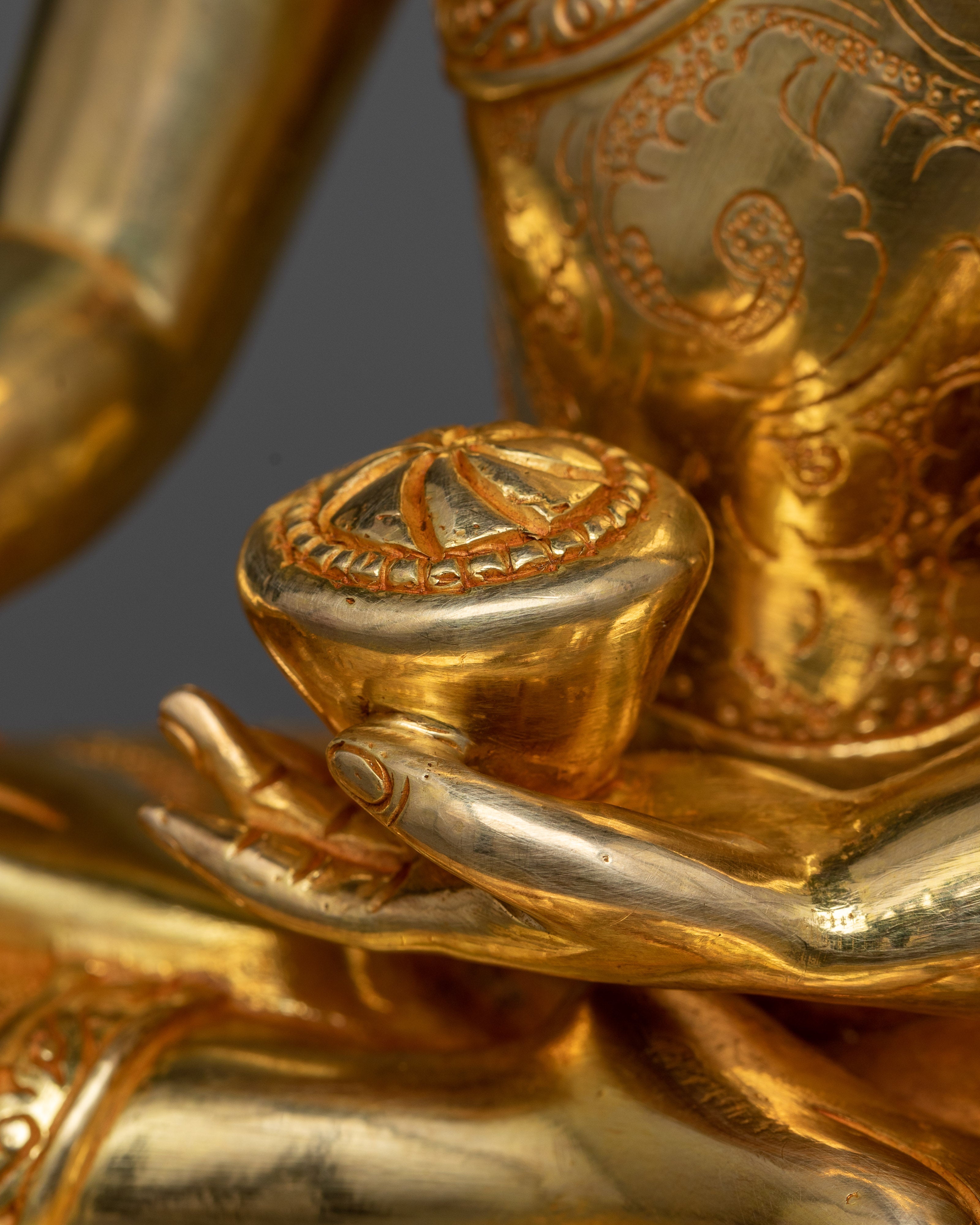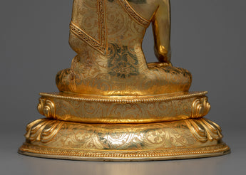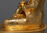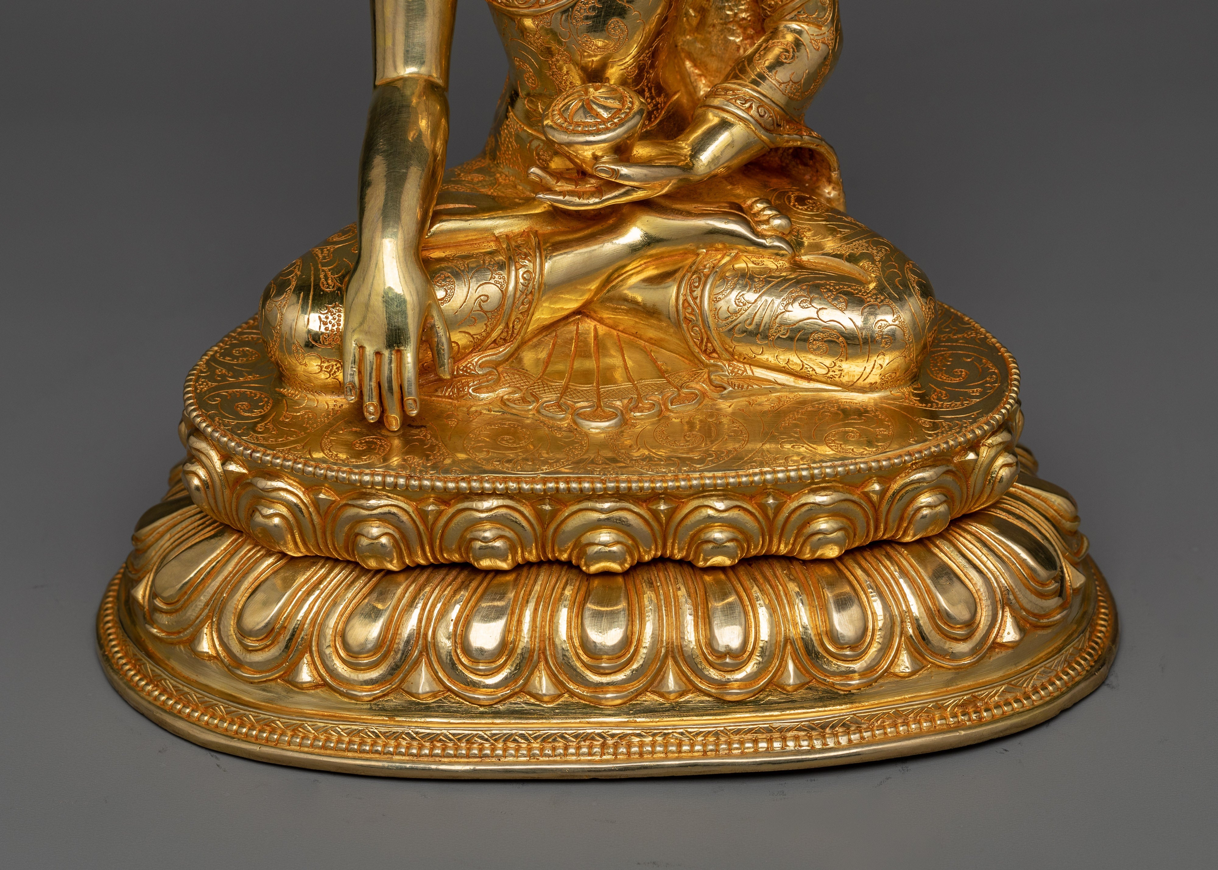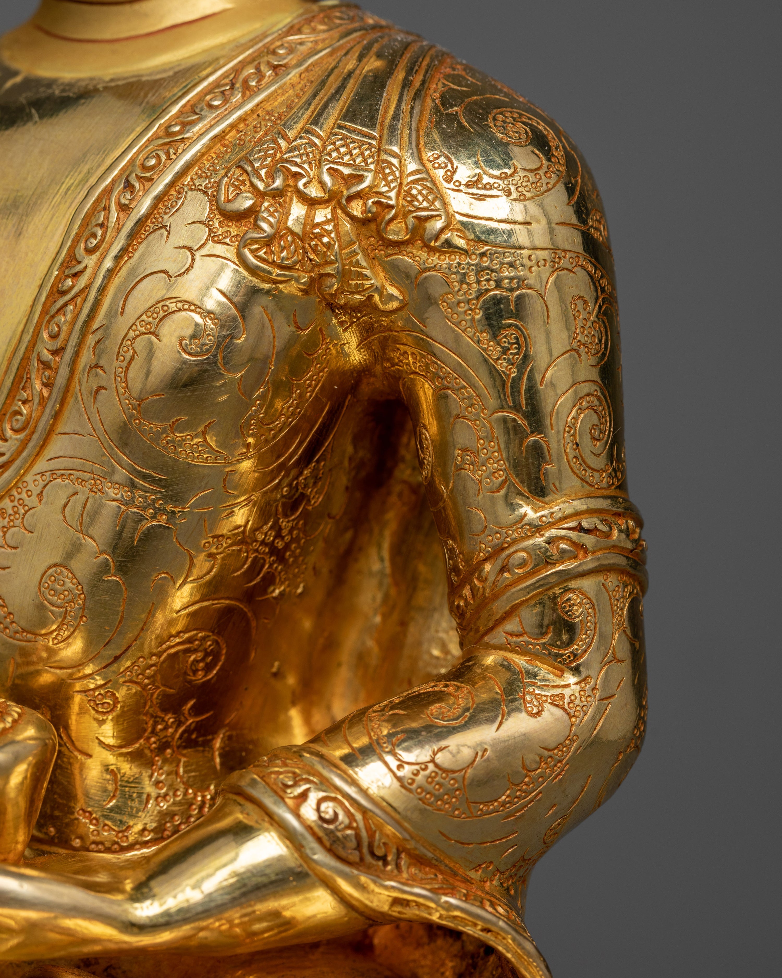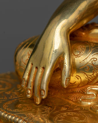 The statue is masterfully carved from copper and gilded with a dazzling layer of 24K gold. The gold and acrylic paintings highlight the depth and intricacy of Shakyamuni Buddha's meditation posture and serene expression. This statue not only captures the Buddha's spiritual majesty, but also lends a sense of elegance and regard to any room, whether it's a home shrine, meditation area, or a place of peaceful reflection.