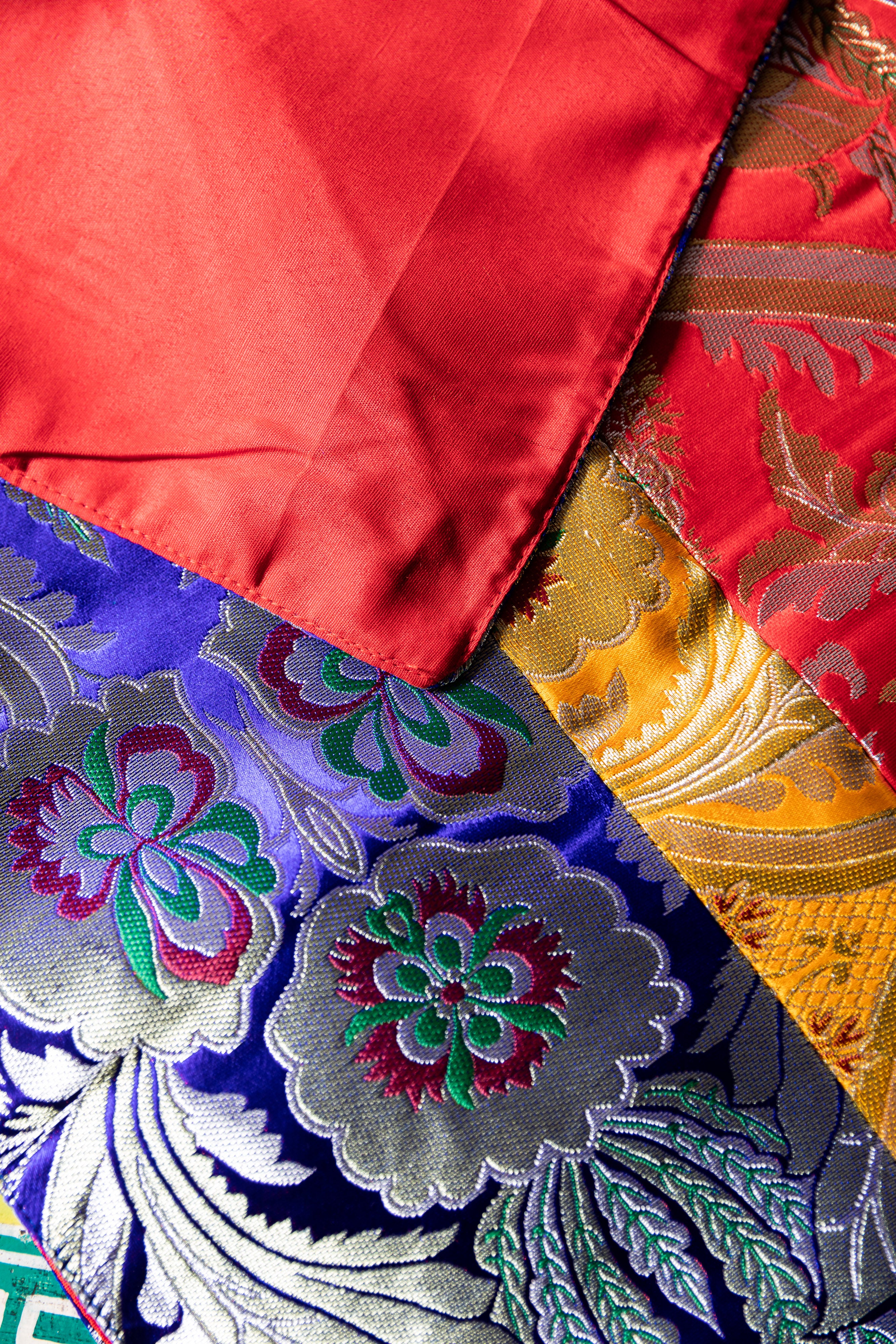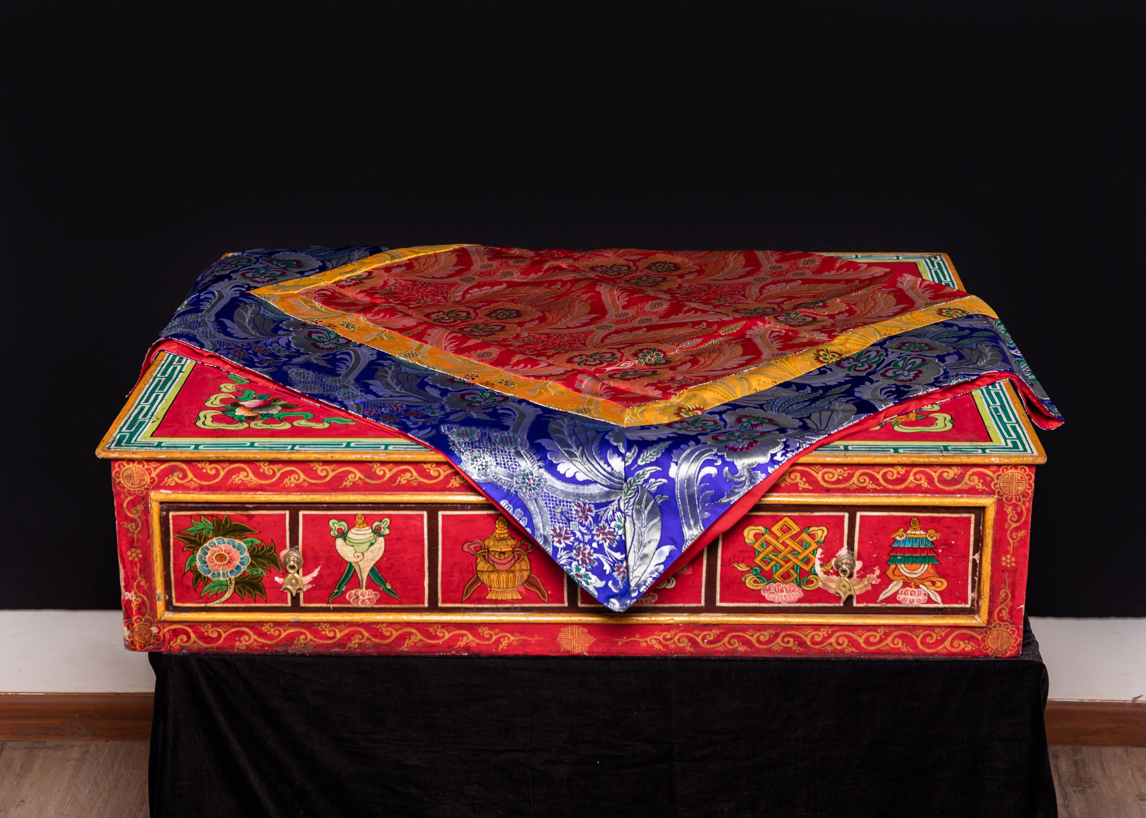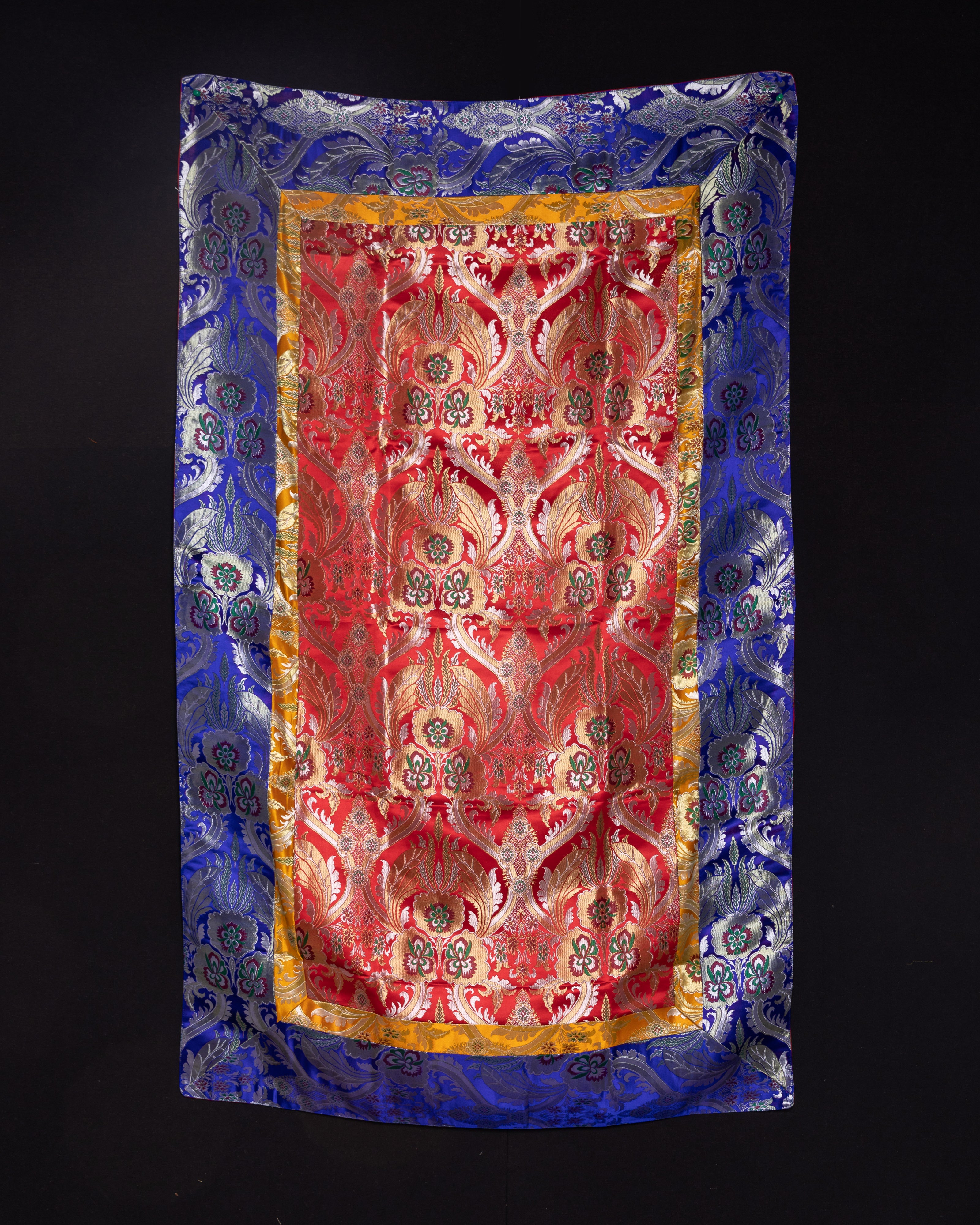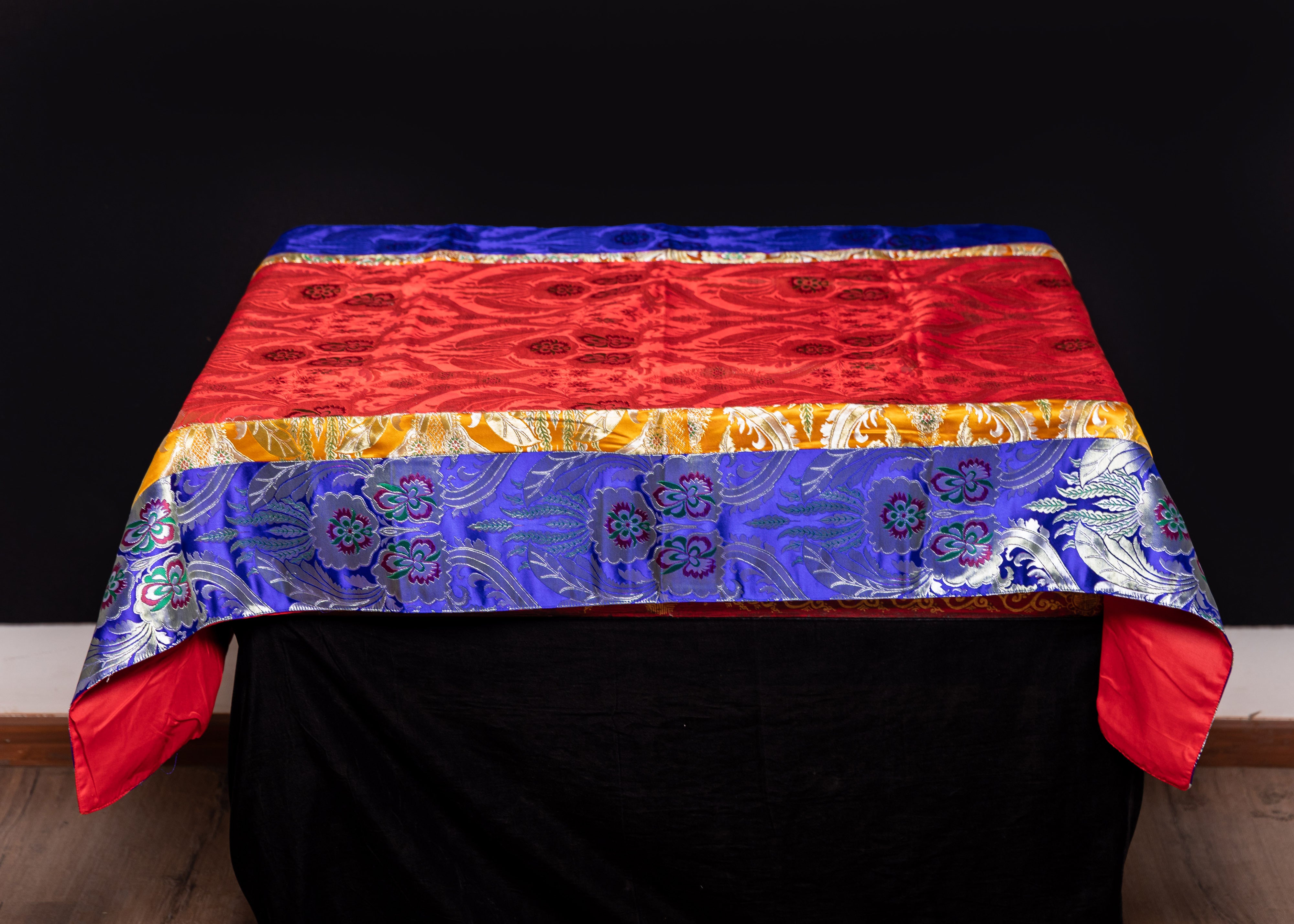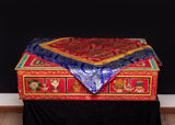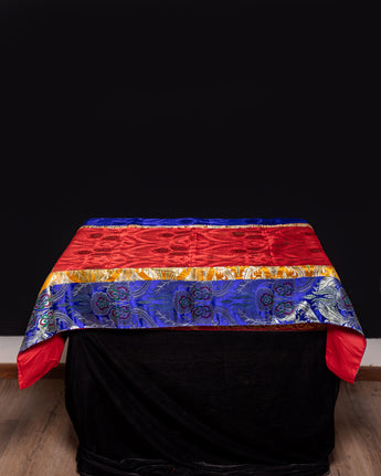 This exquisite silk tablecloth features stunning red and blue brocade patterns, showcasing intricate floral motifs that shimmer with elegance. Traditionally used in Tibetan households and spiritual settings, this cloth brings a refined touch to your home, meditation space, or shrine. Its vibrant colors and rich texture make it an eye-catching centerpiece for any sacred or decorative arrangement.