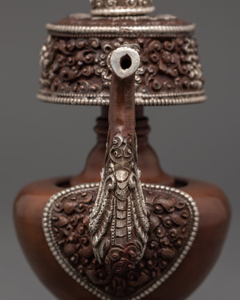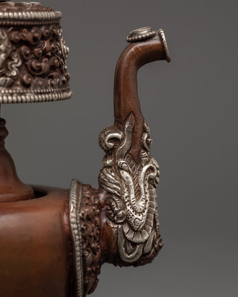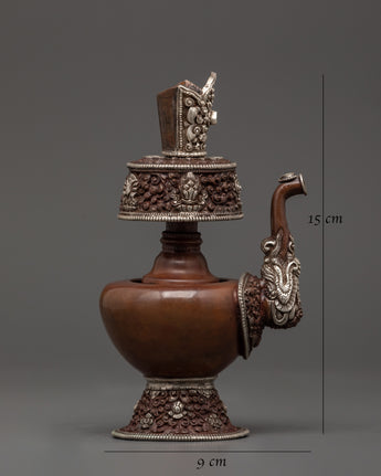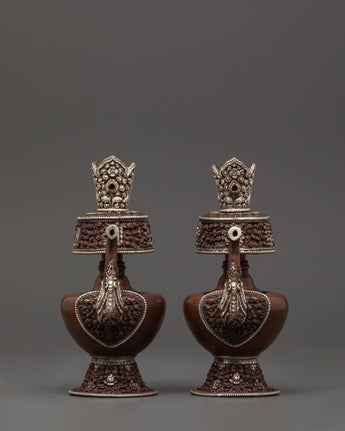 Made from oxidized copper and finished with a beautiful silver plating, this handcrafted Silver-Plated Bhumba Ritual Set represents purity and the sacred flow of blessings. Each piece is 15 cm tall and has a peacock-shaped spout and intricate flower carvings, which are traditional features of Vajrayana Buddhist ritual instruments. These water vases, traditionally used in empowerment ceremonies, are containers for consecrated water that purify areas and invoke divine protection.