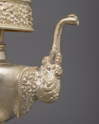 Presenting the magnificent Silver Plated Bhumba Set, an exemplar of customary artistry and eminent spiritual style. Every piece in this set is carefully silver-plated after being handcrafted with a copper body, adding to its religious meaning with a striking visual appeal. The silver plating reflects the spiritual energy of the set and offers a bright brilliance while also symbolizing purity and clarity.