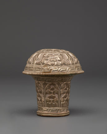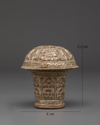 This Silver Plated Brocade Stick Cap showcases exquisite craftsmanship with its detailed copper bodywork accented by elegant silver-plated highlights. Measuring 8.5cm in height and 8cm in width, it is perfectly sized for spiritual ceremonies or as a distinguished addition to your collection. Beyond its beauty, this cap carries cultural significance, making it a meaningful decoration for your altar or a thoughtful gift for those who value spiritual artistry. Combining artistry and symbolism, this cap enhances any setting with its refined presence and appeal.