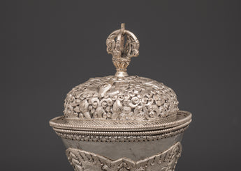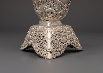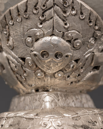 Improve your spiritual practice with this exquisitely handmade Silver Plated Kapala, a traditional Tibetan ceremonial skull cup made of copper and heavily finished with elaborate silver plating. Standing 25cm tall and 15.5cm broad, this ceremonial cup weighs 0.68kg and strikes the ideal mix between durability and beauty. Its complex design features detailed elements that represent significant symbolic value in Tibetan Buddhism and tantric rites, making it a highly sought-after object among practitioners and collectors alike.
