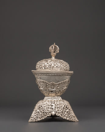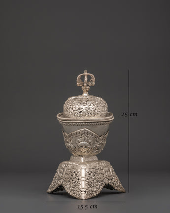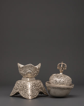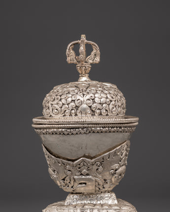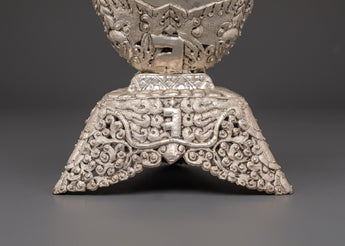 The Kapala has historically been used as a holy vessel in tantric rituals to store offerings such as water, wine, or symbolic items. The silver plating gives a shiny and polished appearance, boosting its spiritual energy and making it ideal for use as a focal point on your altar or meditation room. This kapala is more than just a ceremonial instrument; it represents the transformational power of Buddhist ritual, bringing blessings and spiritual protection. This silver-plated kapala is meticulously created to reflect old Tibetan craftsmanship and spiritual legacy.