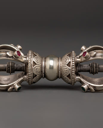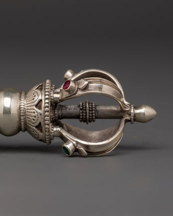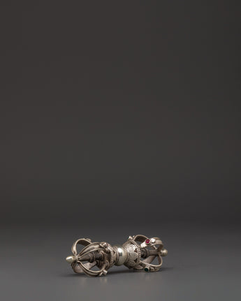 With the Silver-Plated Tibetan Bell and Vajra Set, an exquisitely designed ritual tool combination essential for Buddhist ceremonies and meditation rituals, you can deepen your spiritual practice. The set is made of copper and has a silver plating. Artificial coral stones are used to add a classic yet colorful touch. This handcrafted silver-plated bell and vajra set is a vital addition to any spiritual altar. It is a potent tool for strengthening spiritual ties, deepening meditation, and grounding energy.