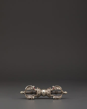 The vajra, meaning "diamond" or "lightning" in Sanskrit, is a significant symbol and ritual instrument in Hinduism and the Buddhist tradition, particularly in the Vajrayana ("diamond way") tradition, from which it derives its name. The Tibetan Dorje represents the indestructibility and efficiency that overcome all obstacles. Symbolically, Dorje Vajra destroys ignorance. In Tibetan Buddhist rituals, the vajra is often paired with the bell, representing the masculine and feminine, the yin and yang, as well as the balance between practical action and compassion. The shape of the Tibetan Dorje is symmetrical, the two pyramidal heads representing samsara and Nirvana, which cancel each other out in its center, thanks to the ring of Emptiness. Placing a Dorje at home would have positive virtues against the various attacks we suffer. The bell or the drums are the feminine aspect of the perfection of wisdom, which directly realizes Emptiness. Vajra or Dorje represents the male aspect as a method or skillful means, embodying the indestructible nature of the absolute. Together, they symbolize the blessing mandala of a practitioner's main yidam deity.