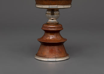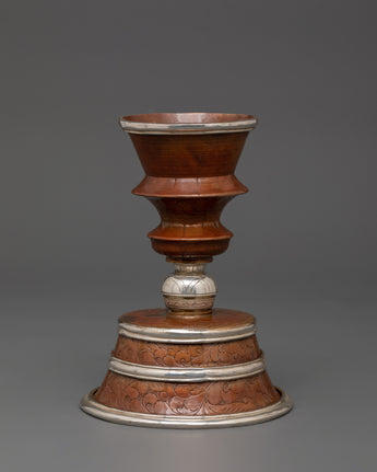 This Tibetan Butter Lamp is a sacred symbol of Buddhist ceremonial history, used in pujas, rituals, and everyday altar activities. The lamp is made of oxidized copper with a silver-plated lining and an internal brass lining. It stands 14.5 cm tall, 10.5 cm in diameter, and has a 7 cm base. This lightweight item, weighing 0.37 kg, is suitable for devotional use.
