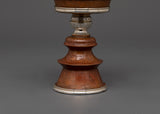 Butter lamps are a vital component of Buddhist offerings, symbolizing the illumination of knowledge and the dispelling of spiritual darkness. Traditionally filled with ghee or oil, these lamps are lit during meditation or religious observances to bring blessings, calm, and clarity. This lamp's exact craftsmanship and original materials make it a spiritual tool as well as a beautiful, sacred item.