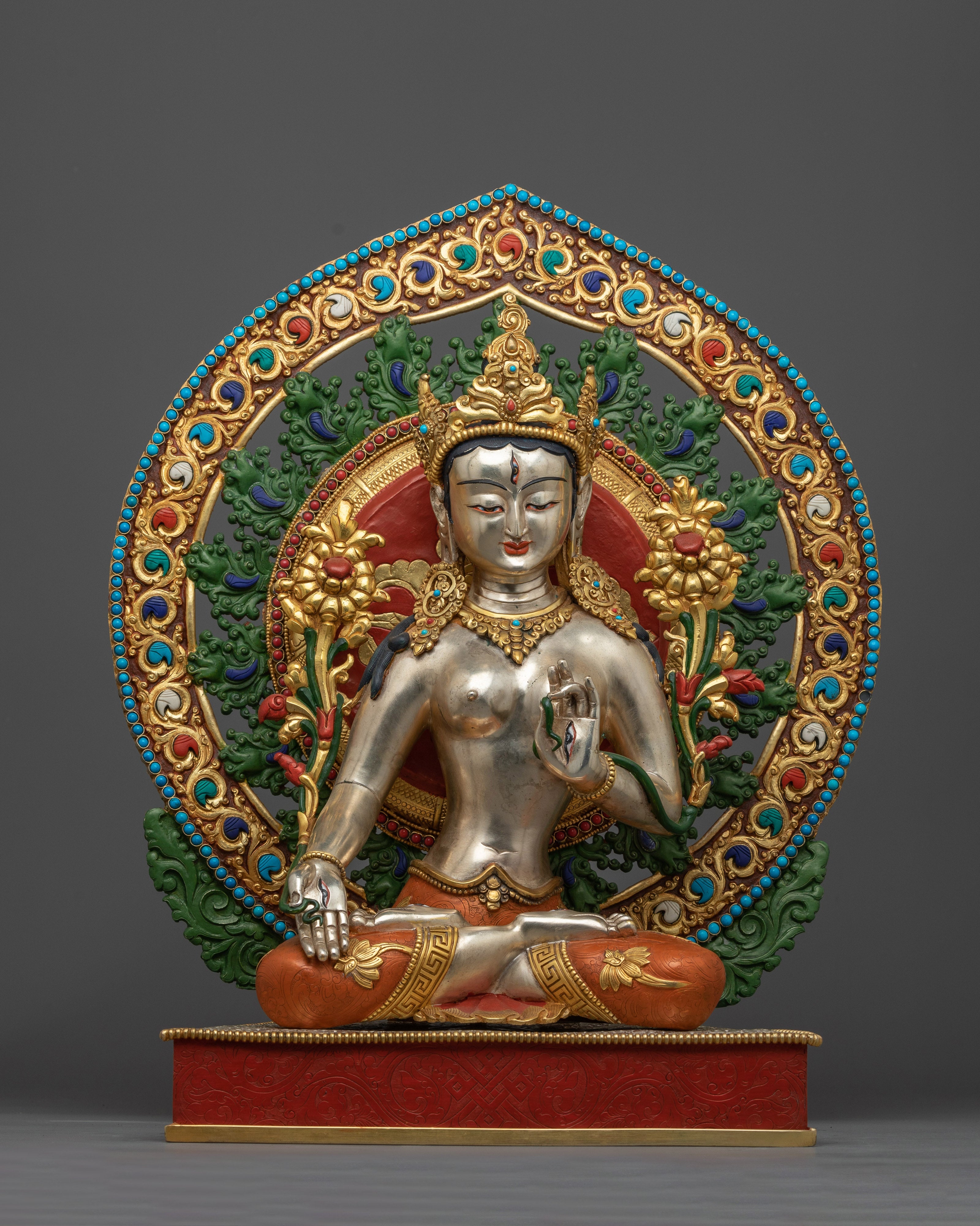 With this magnificent silver-plated statue, you may fully immerse yourself in the healing and protective aura of White Tara, the female Bodhisattva of longevity, health, and tranquility. White Tara is revered for her compassion for all living things, her seven eyes that watch over the planet, and her capacity to bestow health and longevity.
