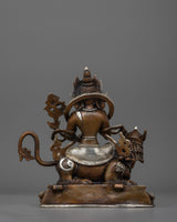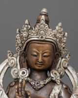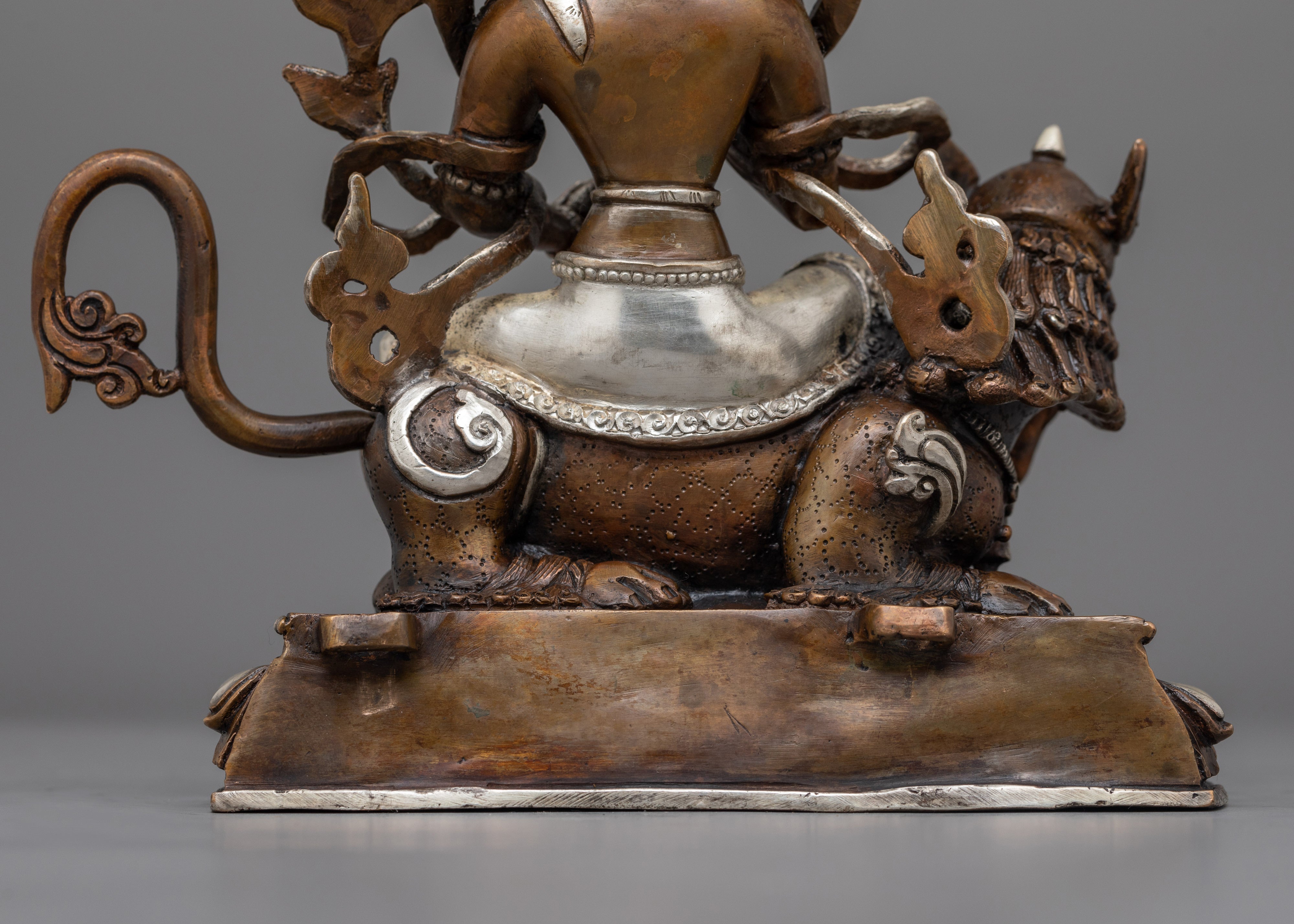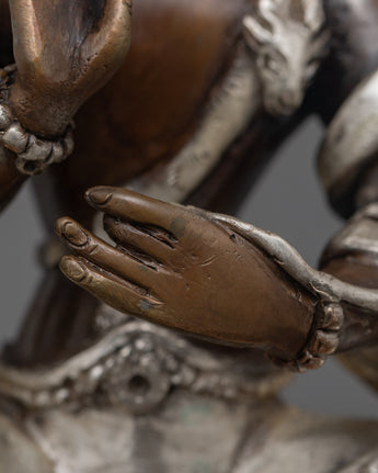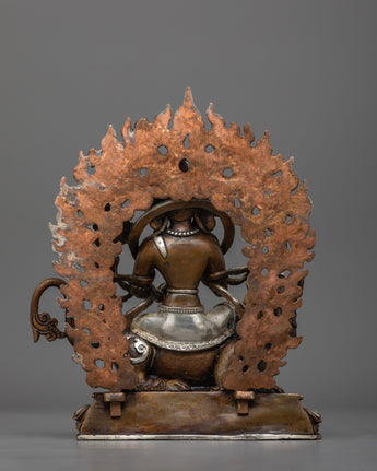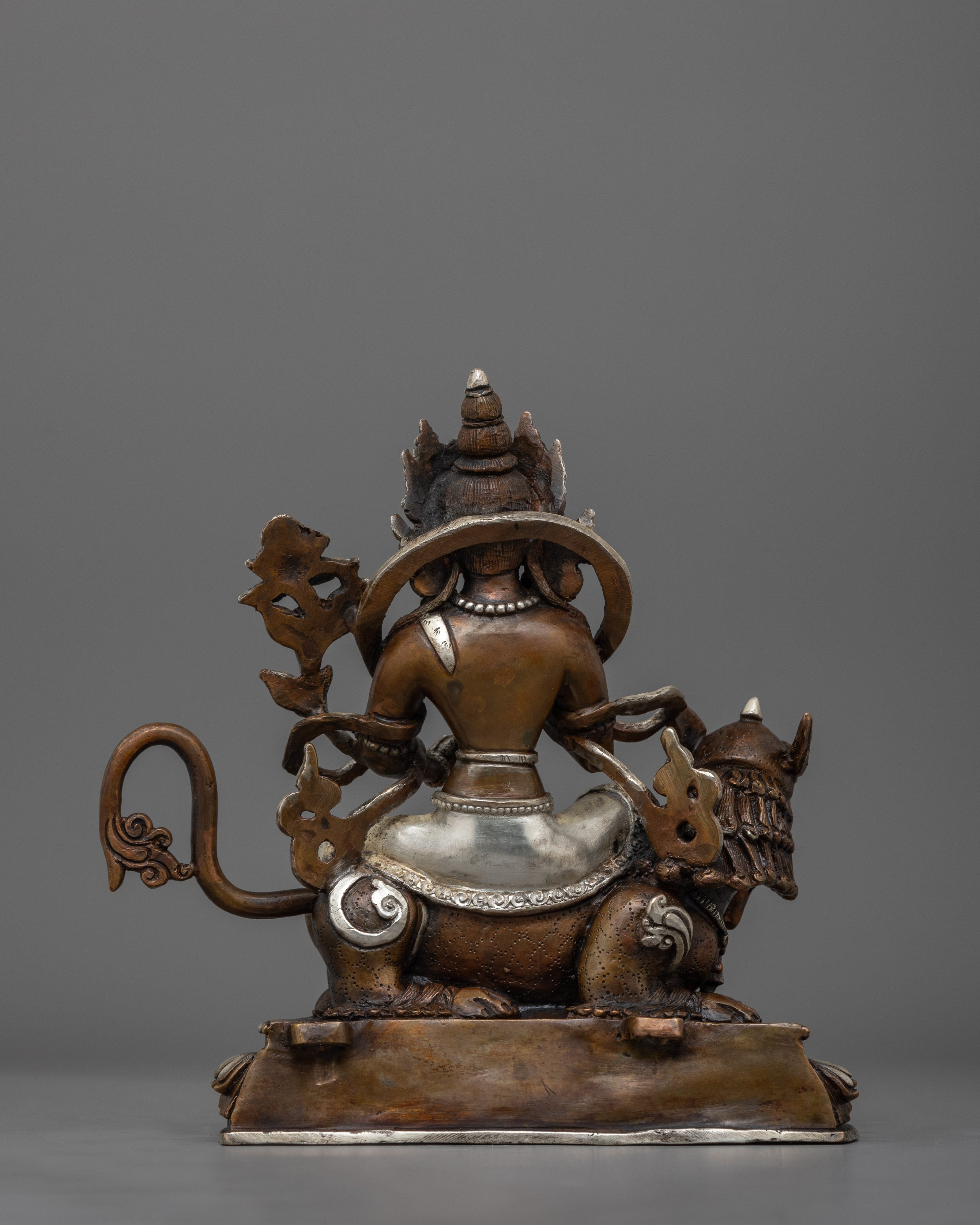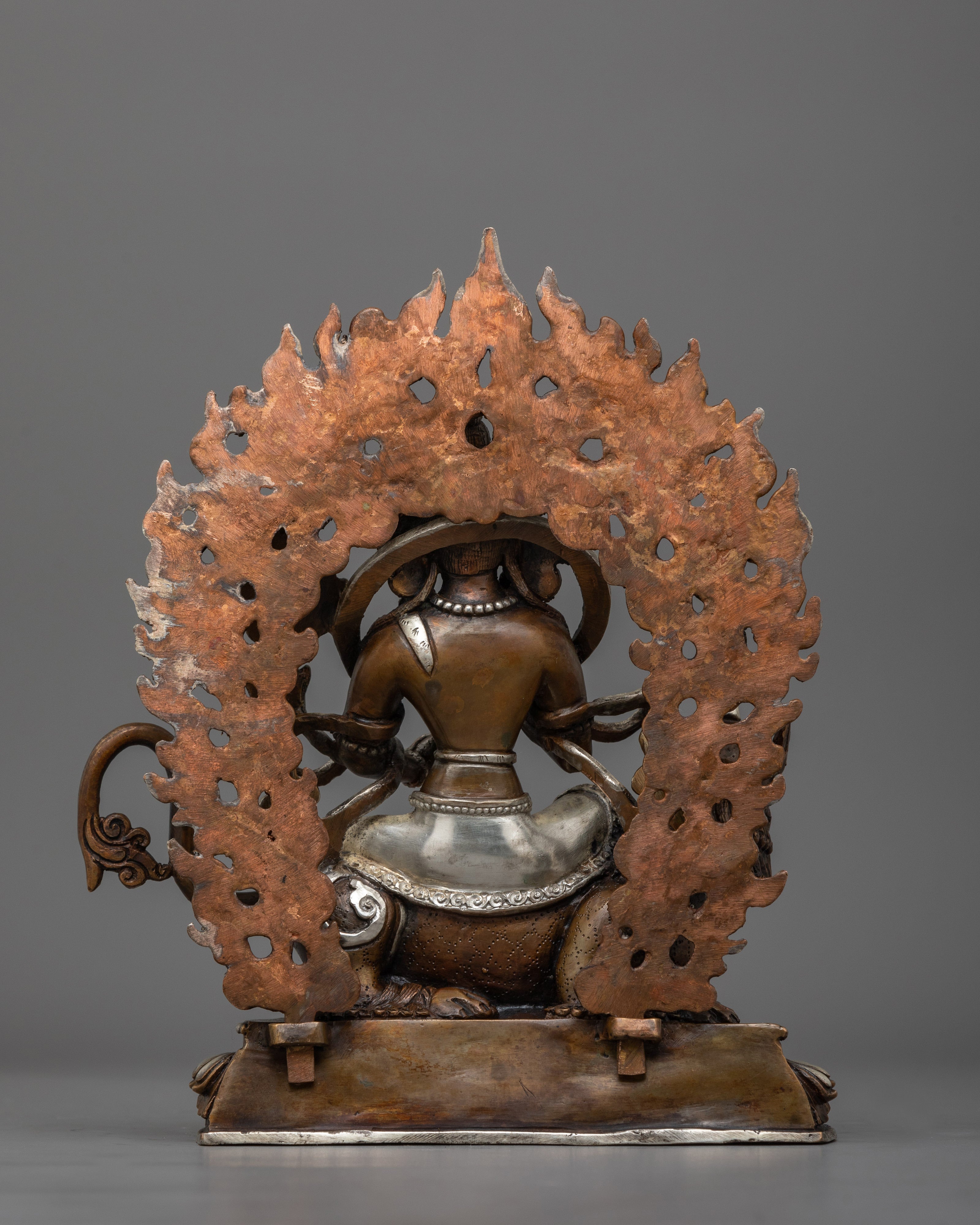 The Simhanada Chenrezig Avalokiteshvara Statue, an embodiment of compassion and knowledge, is precisely built from oxidized copper and gracefully plated in silver. Standing at an astounding height of 9.4 inches (24 cm) and with a base width of 7.7 inches (19.5 cm), this statue, weighing 2.53 kg, makes it a remarkable focal point in any area, offering peace and spiritual connection.