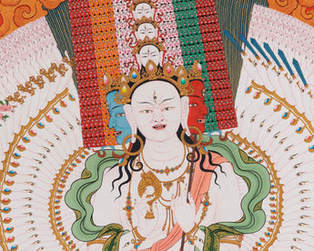 Sitataptra's brilliant white color radiates with love and compassion. In her most common form she is depicted with 1,000 heads, 1,000 arms, 1,000 legs and 1,000,000 eyes. In her two central hands she holds a dharma wheel and the handle of the white parasol from which she takes her name. In her other hands she holds a multitude of various weapons, and her body is adorned with various ornaments.